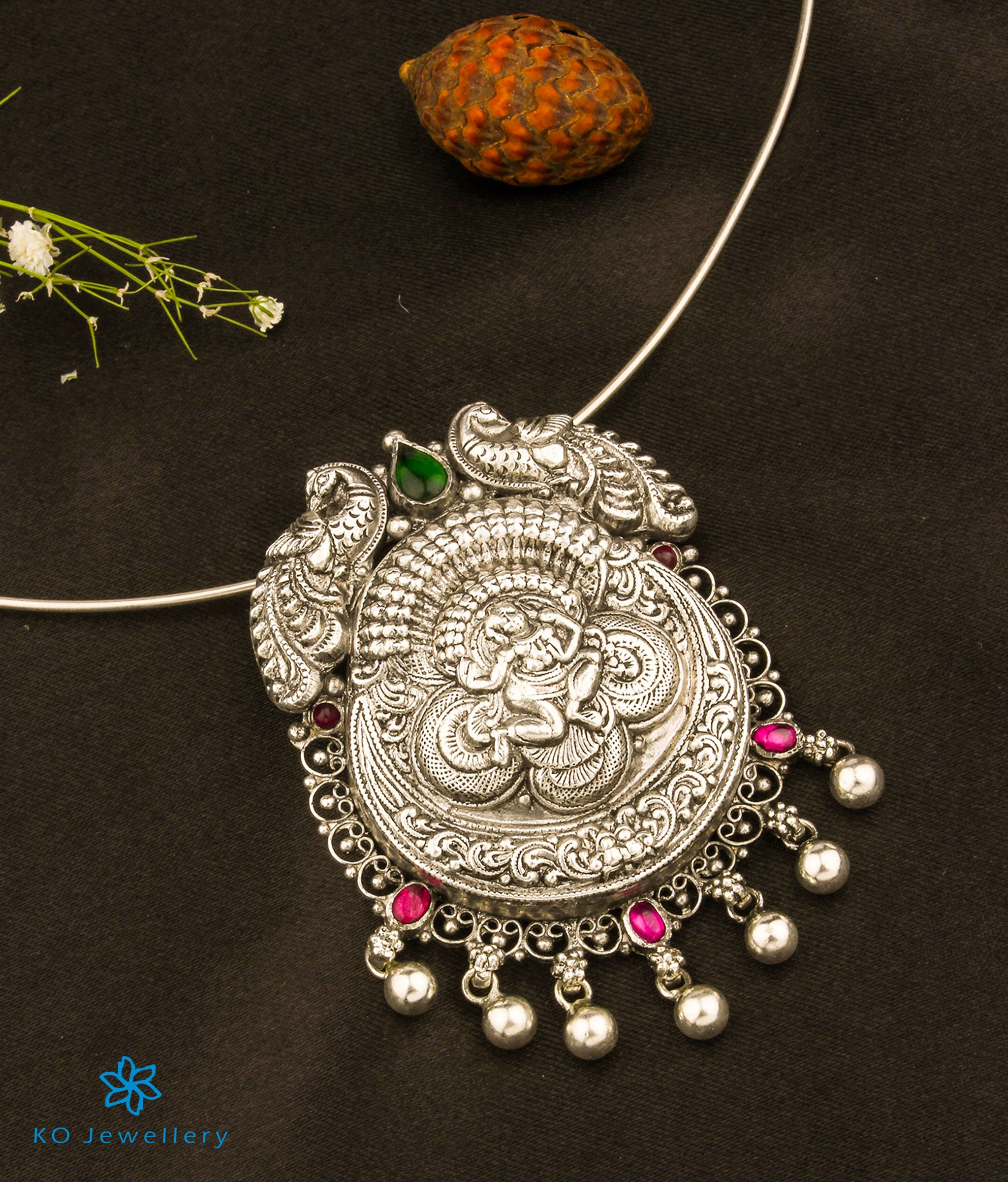An attractive statement pendant with a motif that can be paired with ethnic attire or sarees. Crafted using techniques used in ancient South Indian antique gold temple jewellery the entire piece is crafted in pure Sterling Silver (92.5%) .