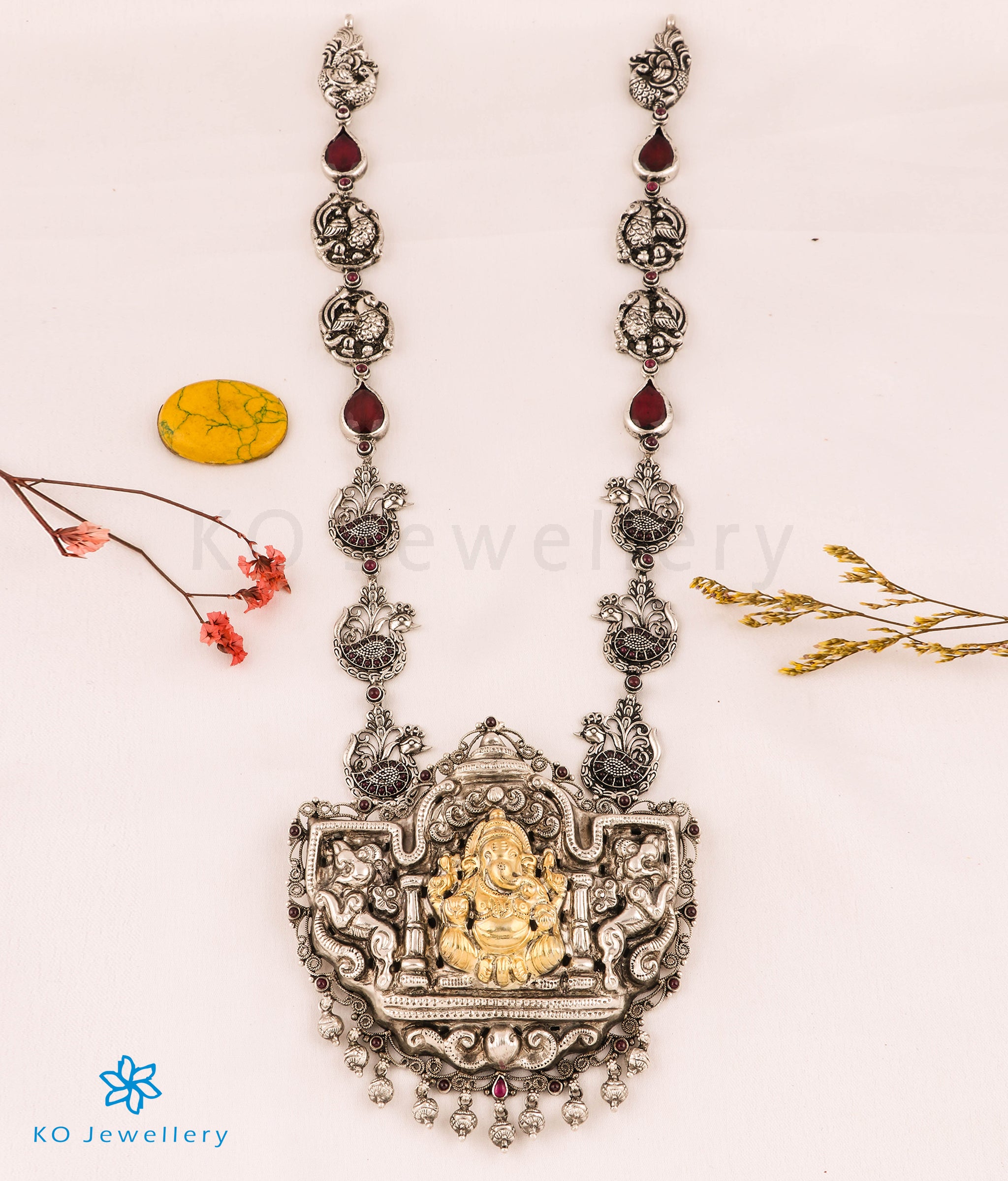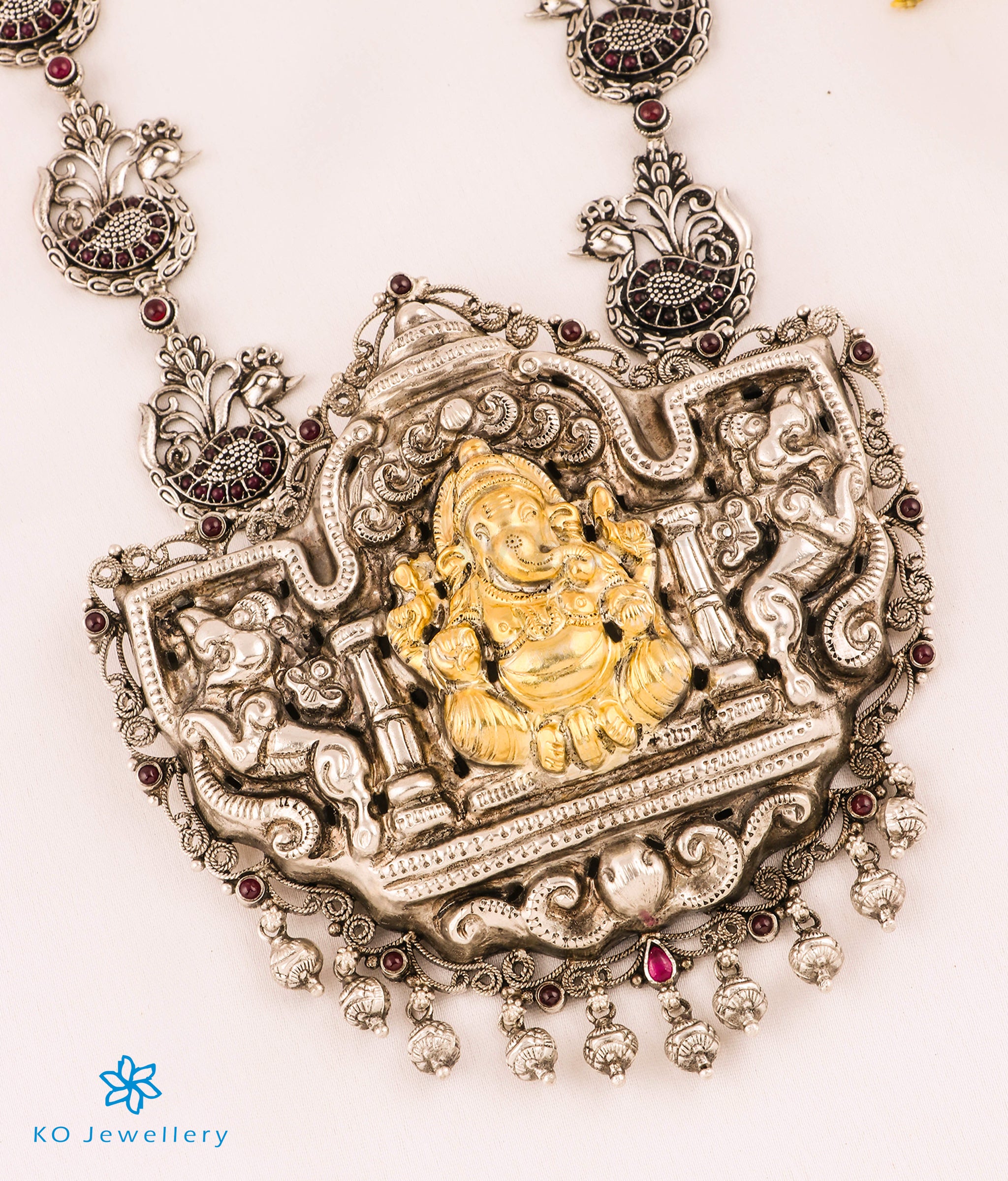 The Mahaganapati Silver Nakkasi Peacock & Kemp Necklace (Oval)