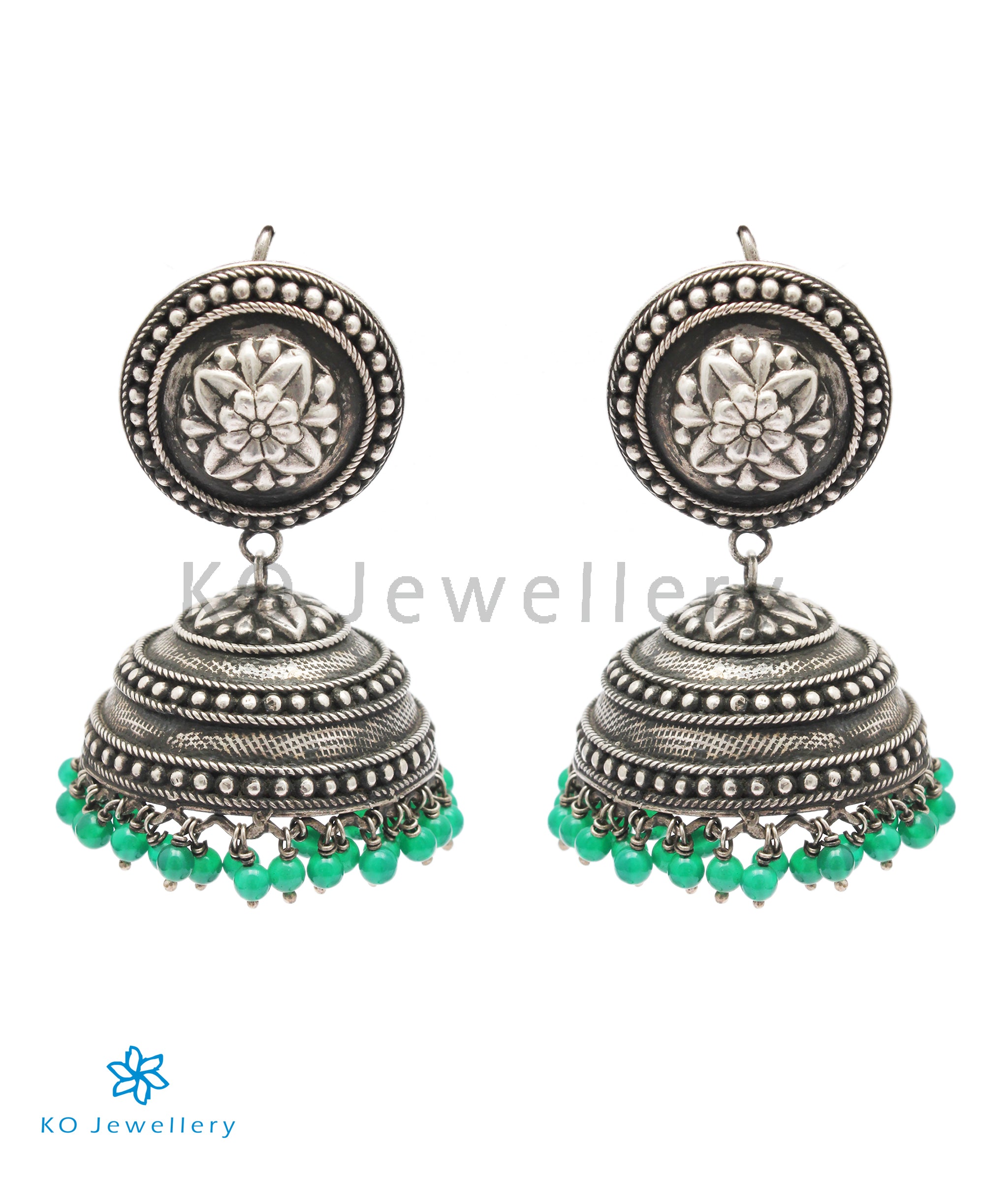 A real showstopper of a jhumka ,this pair will surely steal all the attention. The ornate and impeccably handcrafted jhumka is decorated with floral motifs. Handcrafted using techniques used in ancient South Indian antique gold temple jewellery the entire piece is crafted in Sterling Silver (92.5%) silver and oxidised.