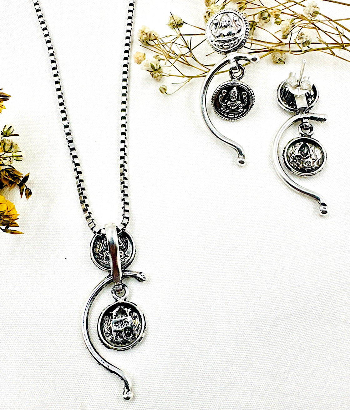 Let a unique style adorn your neck with this elegant Sterling Silver (92.5%) pendant & earrings that carry the Goddess lakshmi motif in a minimal contemporary design.The earrings come with a push back closure.