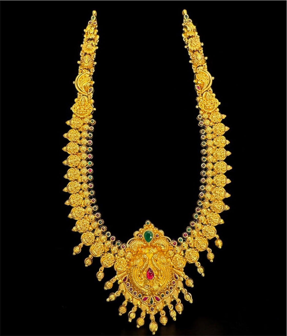 Experience the timeless allure of South Indian heritage with this handcrafted long haaram, meticulously made in 92.5 pure silver and finished with rich 24K gold plating. Lightweight yet opulent, it is designed for brides who seek grandeur without compromising comfort.