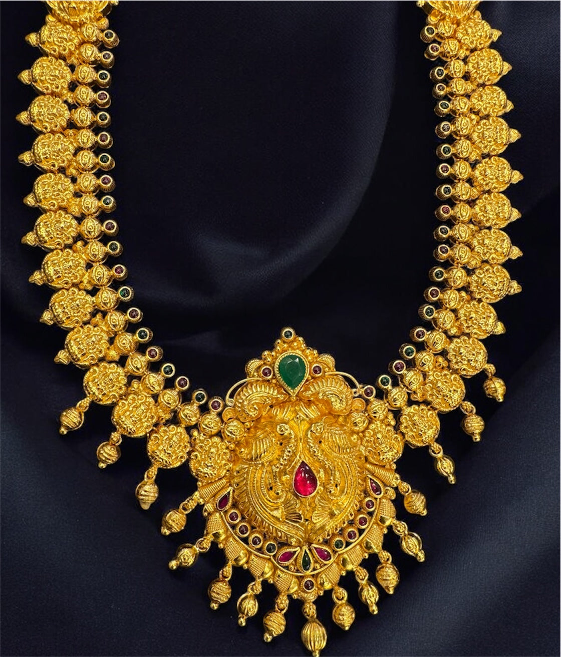 The necklace features a beautifully sculpted peacock motif—an enduring symbol of beauty, grace, and auspicious beginnings. Each detail is brought to life with traditional Nakshi craftsmanship, giving the piece an antique, temple-inspired character. Vibrant kemp stones are intricately set throughout, adding depth, colour, and the unmistakable charm of classical South Indian jewellery.