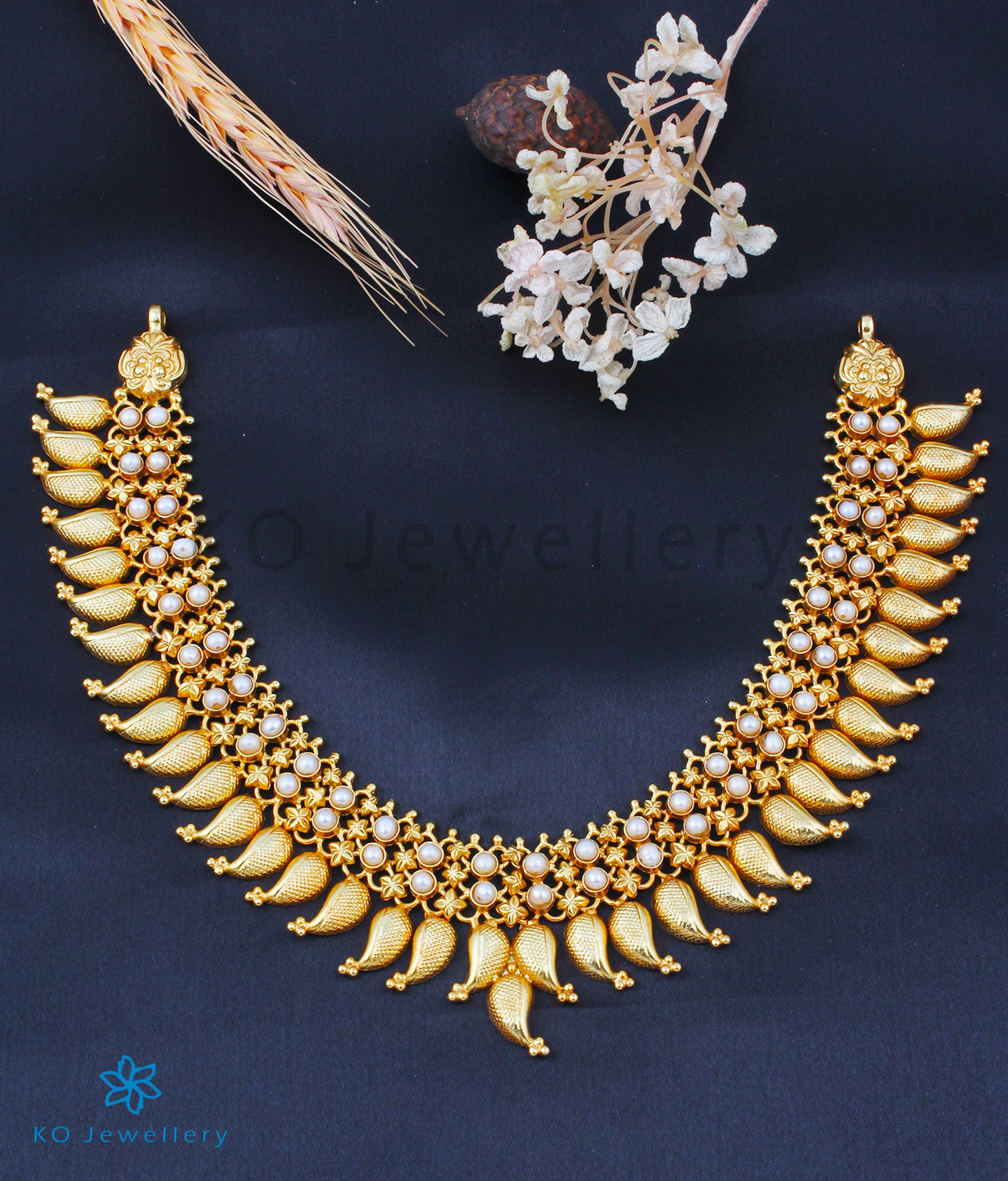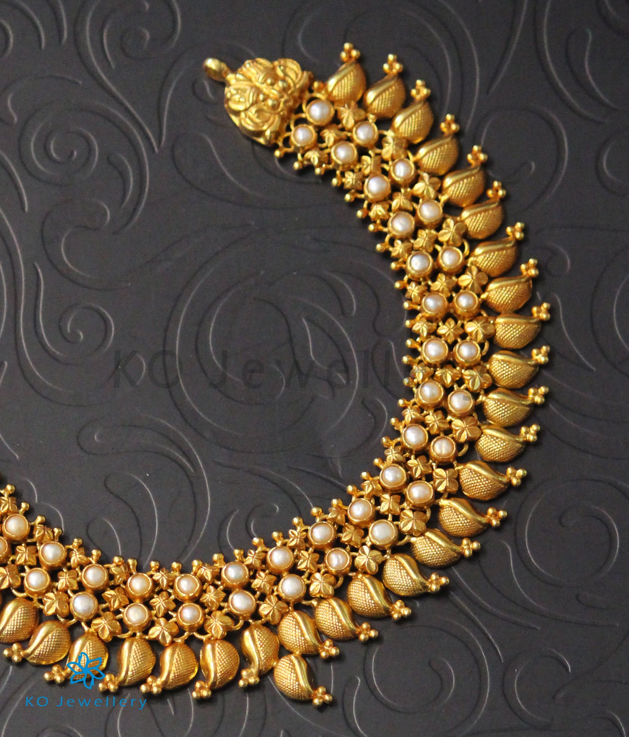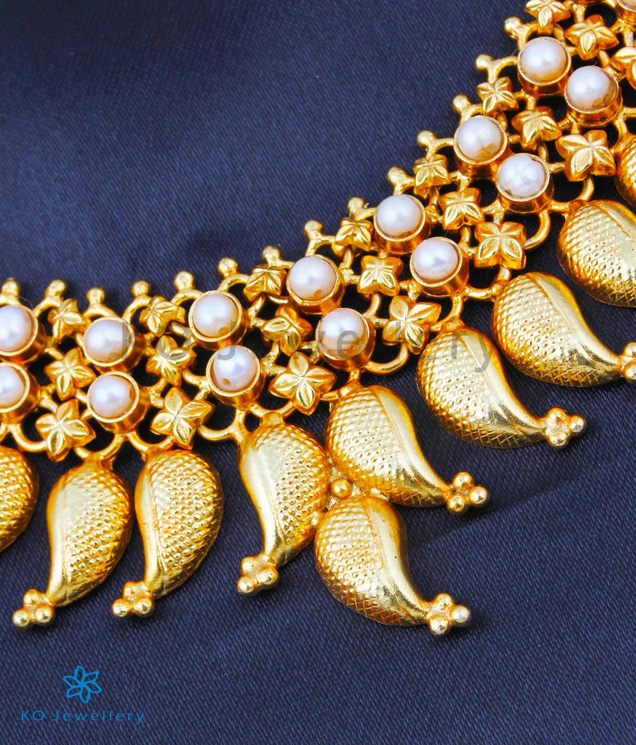 A gorgeous choker-necklace in a traditional design ,this piece sits beautifully around your neck.Crafted using techniques used in ancient South Indian antique gold temple jewellery the entire piece is crafted in pure Sterling Silver (92.5%) and decorated with natural Pearl.This necklace is paired with matching Pearl ear-studs .