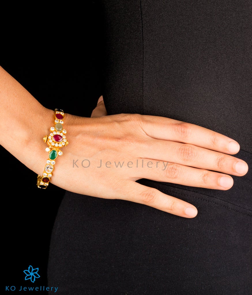 Let your hands soak all the attention when you wear this gorgeous bracelet in navratna colours.Beautiful oval-shaped navaratna stones are framed by small white zircons in Sterling Silver (92.5%) to create this exclusive piece. This seamlessly handcrafted bracelet can be opened to gently fit your hand. You could choose to buy it single or in a pair. The price listed is for a single bangle.