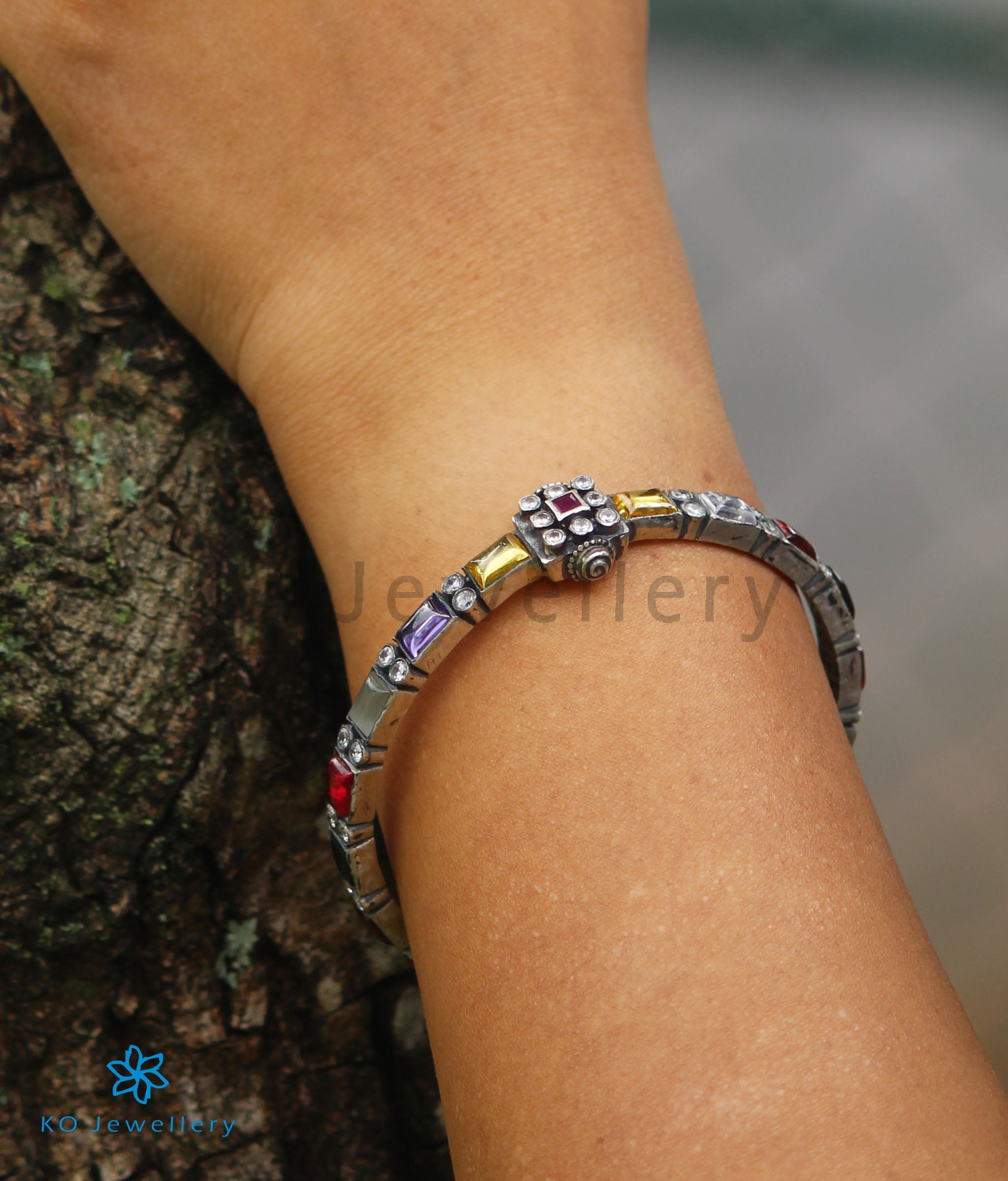This is a gorgeous bracelet which is decorated with navartna stones. Handcrafted in Sterling Silver (92.5%) ; this unique design will make a great addition to your collection. This seamlessly handcrafted bangle can be opened to gently fit your hand. You could choose to buy it single or in a pair. The price listed is for a single bangle.