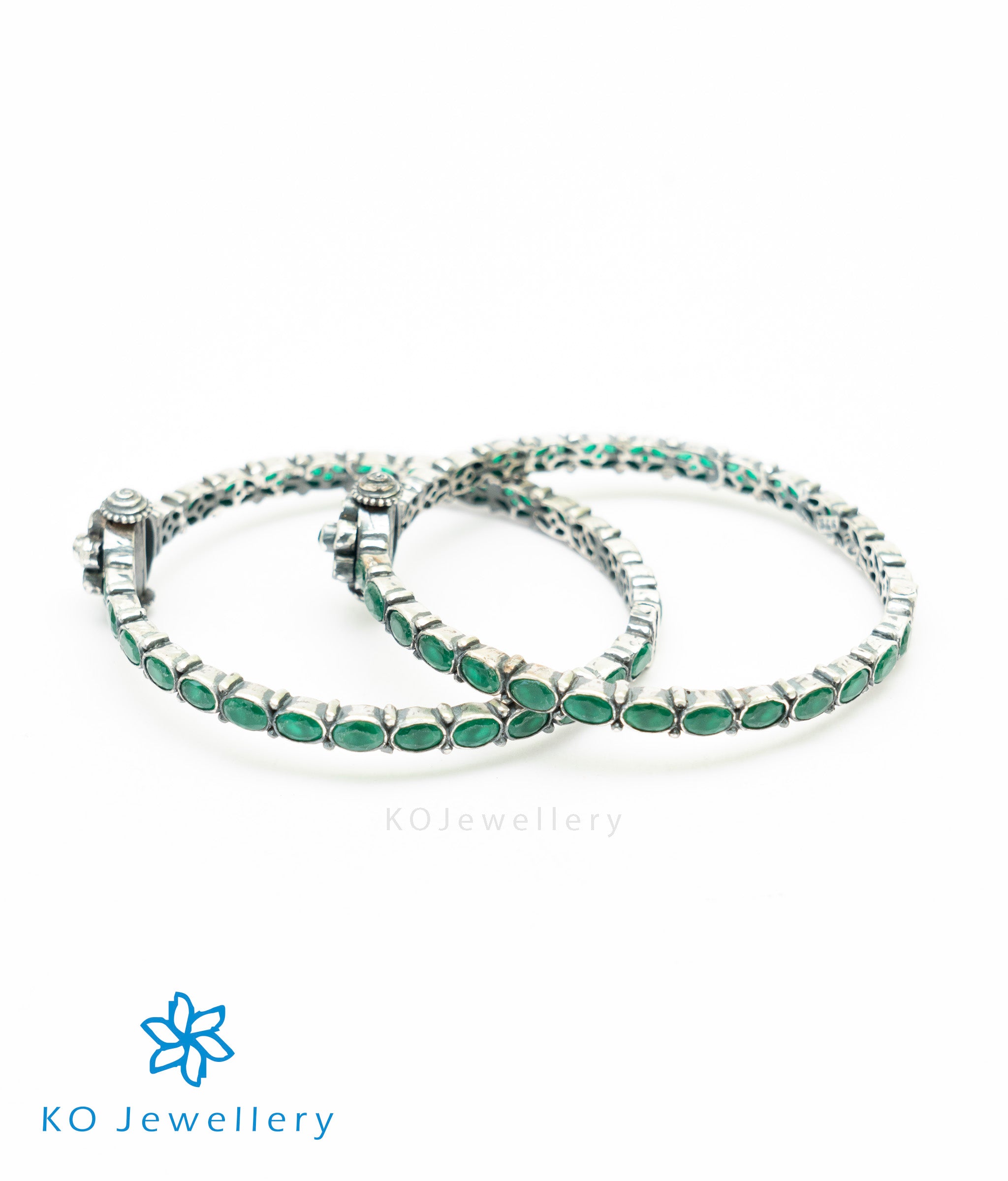 Let your hands soak all the attention when you wear this gorgeous bracelet in green.Beautiful oval-shaped green stones are framed in Sterling Silver (92.5%) to create this exclusive piece. This seamlessly handcrafted bracelet can be opened to gently fit your hand. You could choose to buy it single or in a pair. The price listed is for a single bracelet.