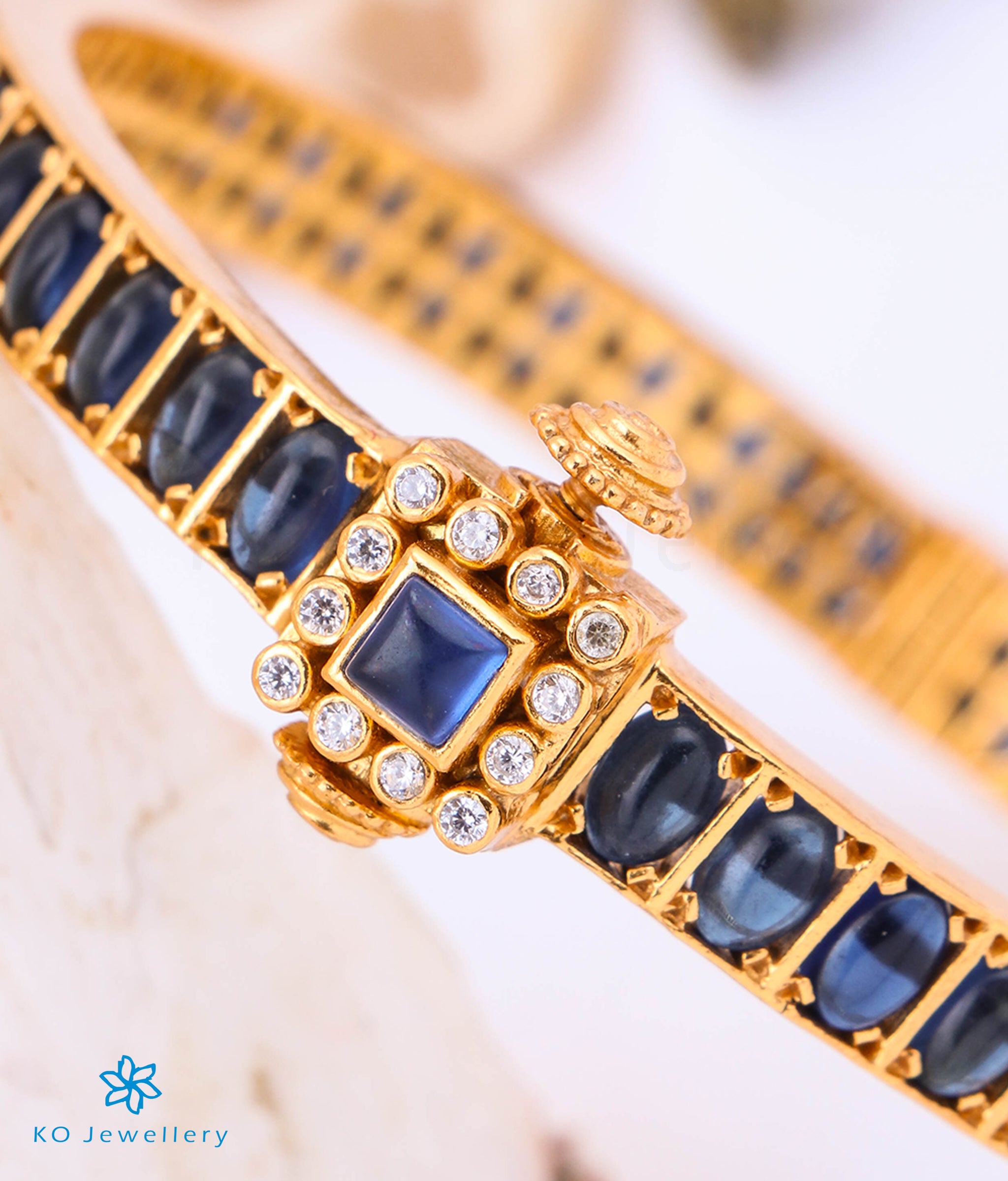 Outshine everyone with this gorgeous bracelet. Beautiful oval-shaped blue kempu stones are fringed with tiny AAA+ Quality Cubic Zirconia in Sterling Silver (92.5%) to create this exclusive piece. This seamlessly handcrafted bangle can be opened to gently fit your hand. You could choose to buy it single or in a pair. The price listed is for a single bangle.