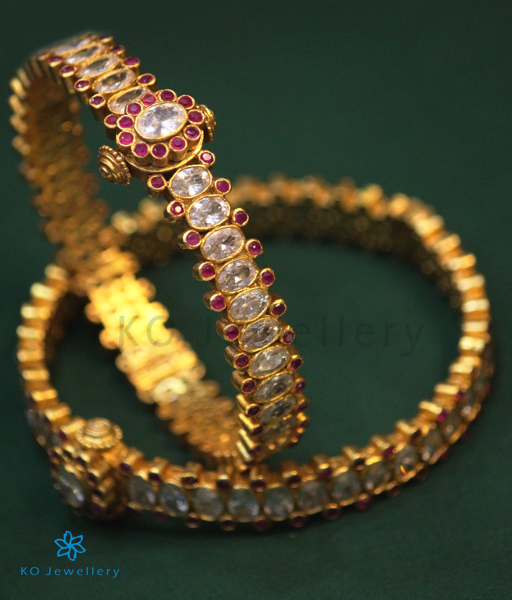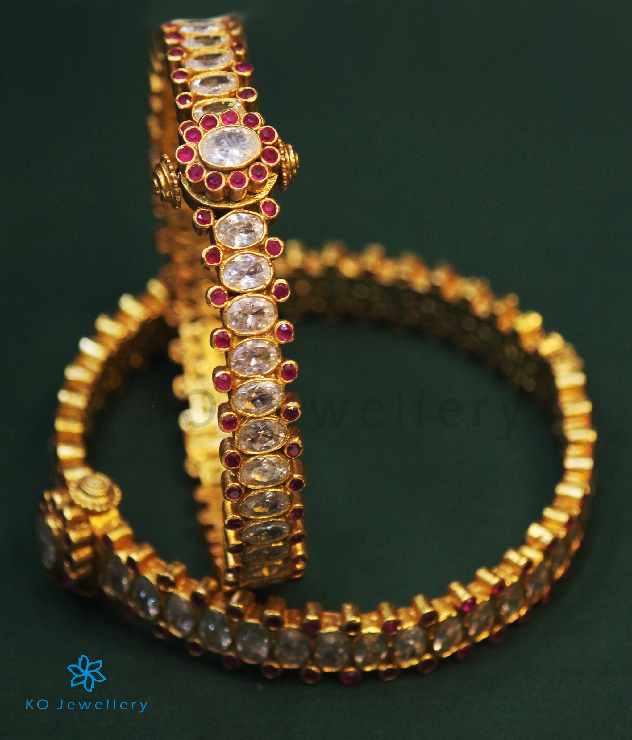 Outshine everyone with this gorgeous bracelet.Beautiful oval-shaped kempu stones are fringed with tiny zircons in Sterling Silver (92.5%) to create this exclusive piece. This seamlessly handcrafted bangle can be opened to gently fit your hand. You could choose to buy it single or in a pair. The price listed is for a single bangle.
