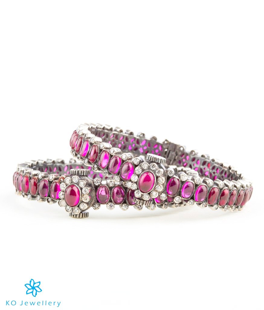 Outshine everyone with this gorgeous bracelet.Beautiful oval-shaped kempu stones are fringed with tiny white zircons in Sterling Silver (92.5%) to create this exclusive piece. This seamlessly handcrafted bangle can be opened to gently fit your hand. You could choose to buy it single or in a pair. The price listed is for a single bangle.