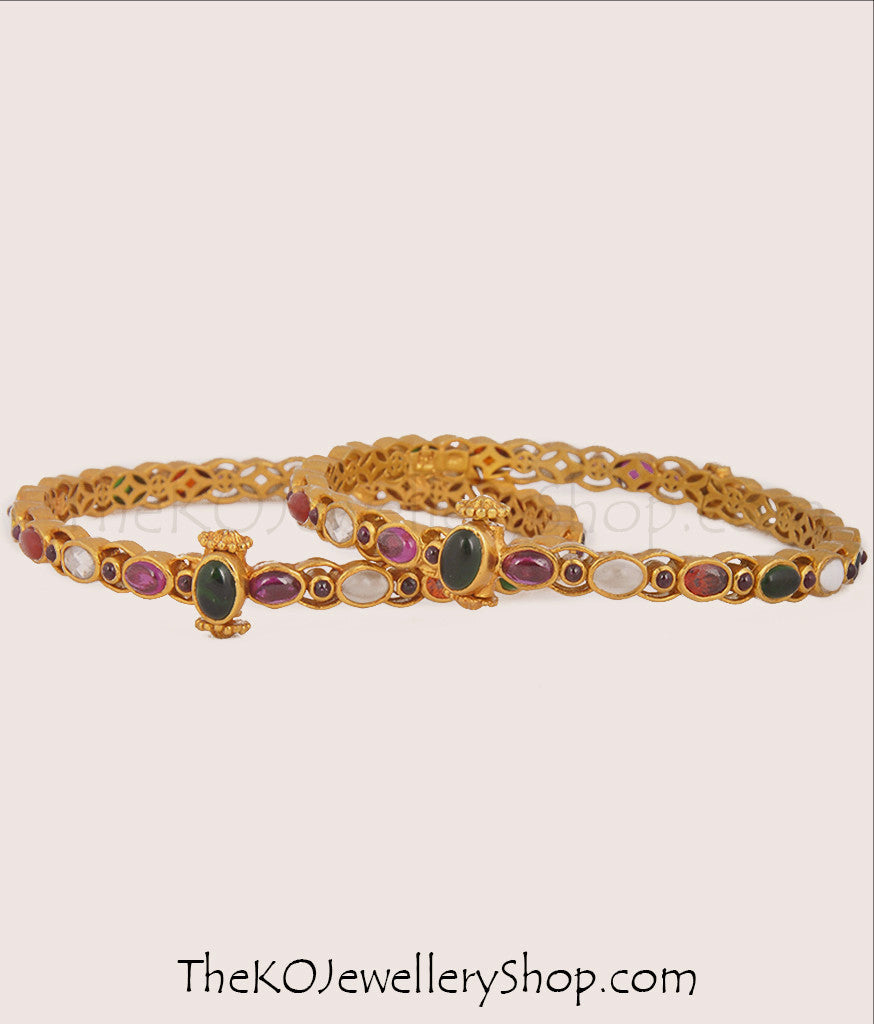 A beautiful openable bangle or Kada in Sterling Silver (92.5%) studded with Navratna gemstones this is a gorgeous accessory. This is a kada with a screw that can be opened, so it fits all sizes from 2.2 upto 2.6.