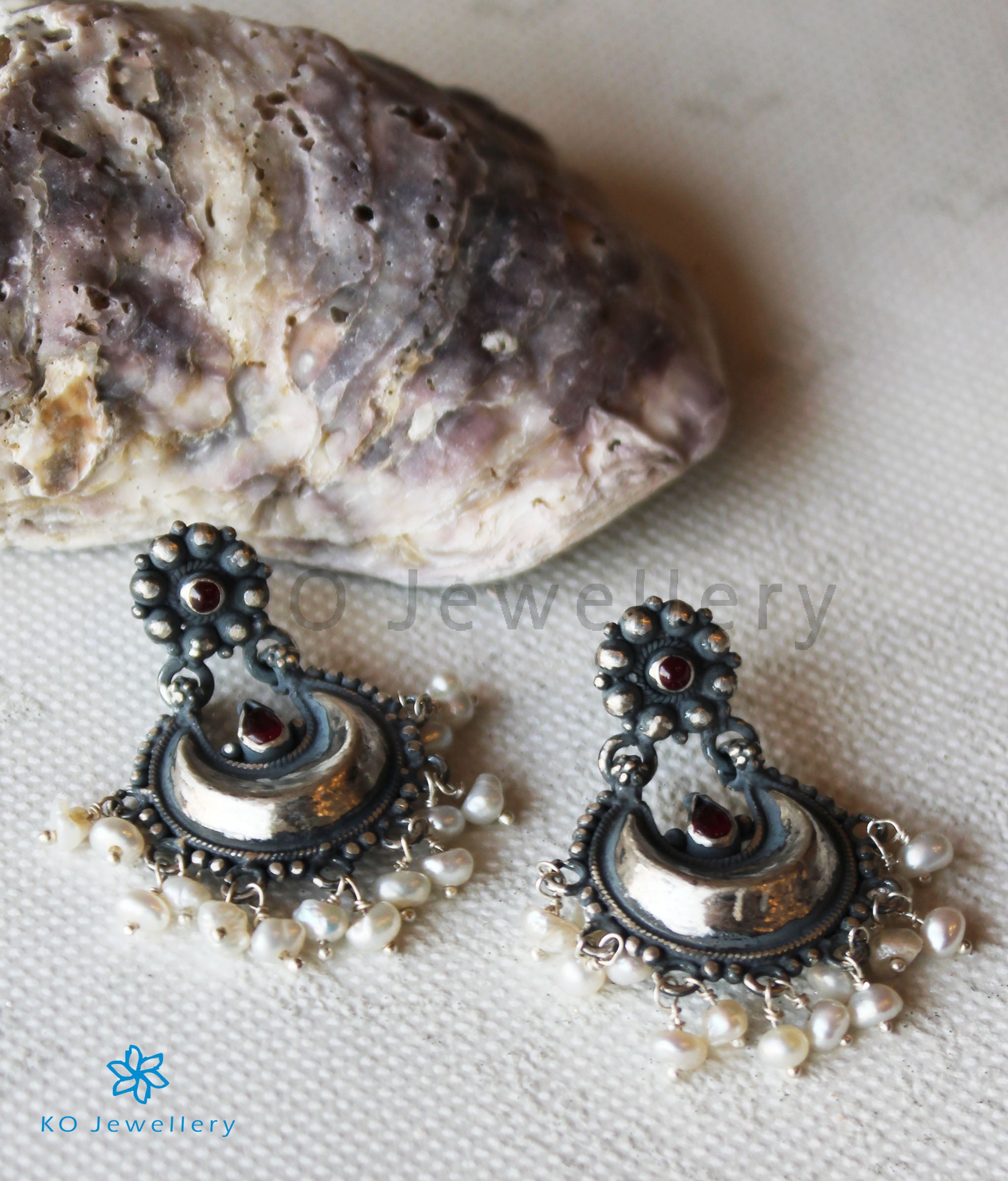 A gorgeous pair of earrings , crafted using techniques used in ancient South Indian antique gold temple jewellery the entire piece is crafted in pure Sterling Silver (92.5%) and oxidised.The pearls add a touch of elegance.