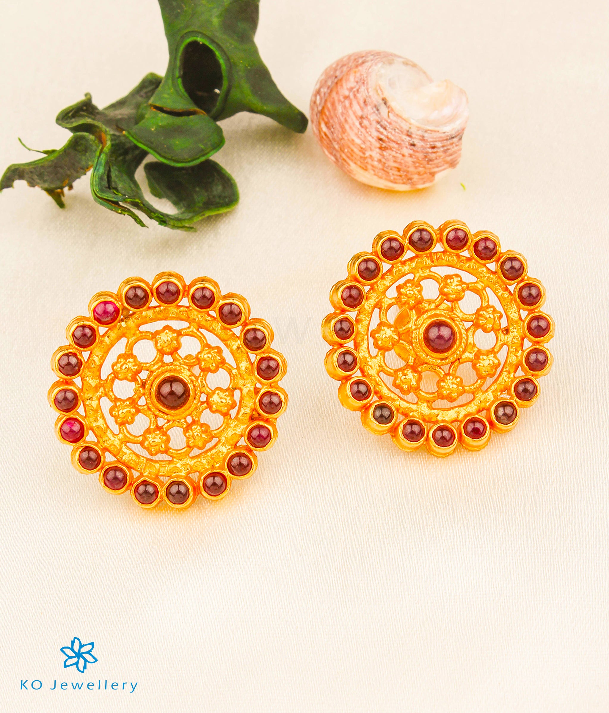 This is an exquisite pair of earrings that have been finely crafted using the South Indian temple gold jewellery techniques, with kempu stones. Handcrafted from Sterling Silver (92.5%) and gold-dipped , pair it with a traditional dress to stand out from the crowd.