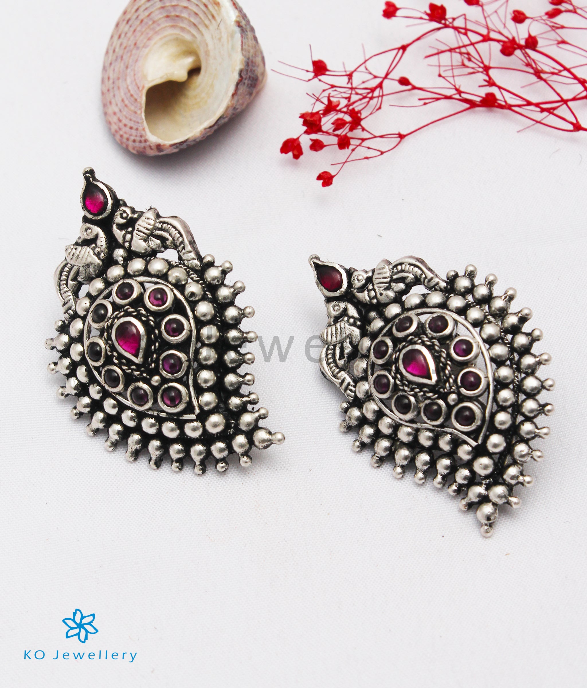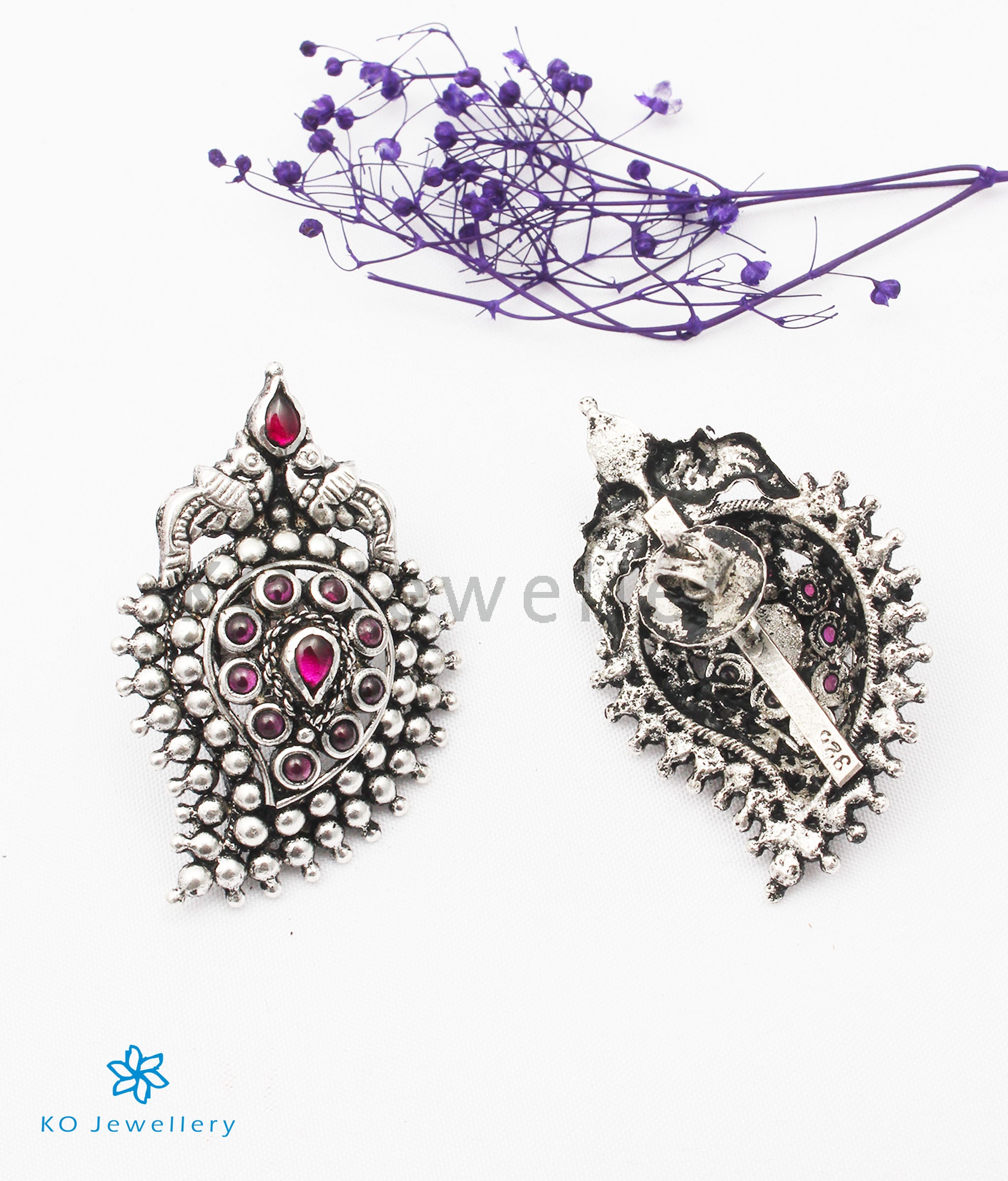 An ornate pair of earrings set in Sterling Silver (92.5%) that combines the mango motif and kempu stones to create a stunning piece of traditional jewellery that will look gorgeous. This is a versatile piece that can be paired with ethnic attire or sarees.