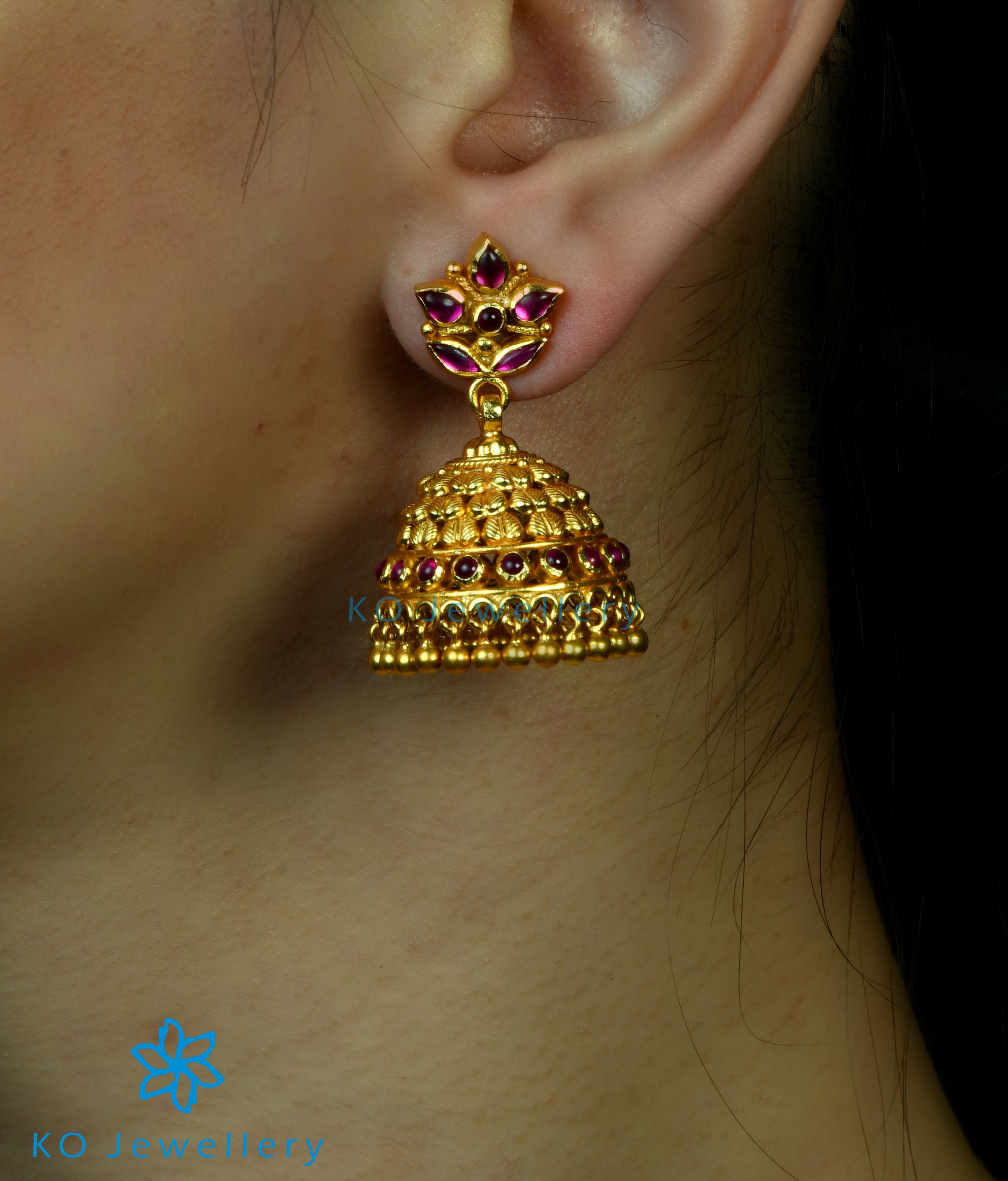 Intricately handcrafted jhumkas with a kempu stone ear-stud and decorated with golden beads, this is a gorgeous pair. Crafted using techniques used in ancient South Indian antique gold temple jewellery the entire piece is crafted in Sterling Silver (92.5%) silver and gold dipped.