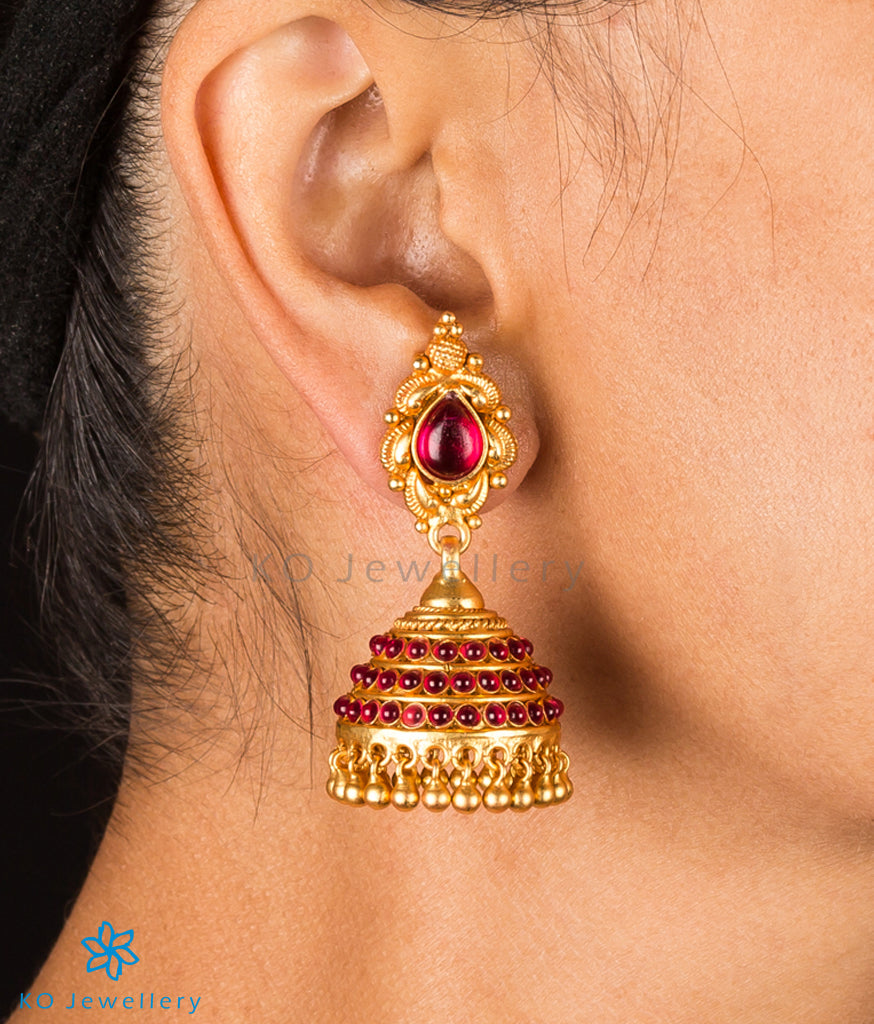 An ornately designed jhumka handcrafted from Sterling Silver (92.5%) and gold-dipped to perfection. The beautifully designed jhumka is an eclectic mix of tradition and contemporary designing and is artistically decorated with red kempu stones, adding to its brilliance. Pair it with your favourite sari or traditional dress to make heads turn. The earring comes with a bombay-screw at the back.