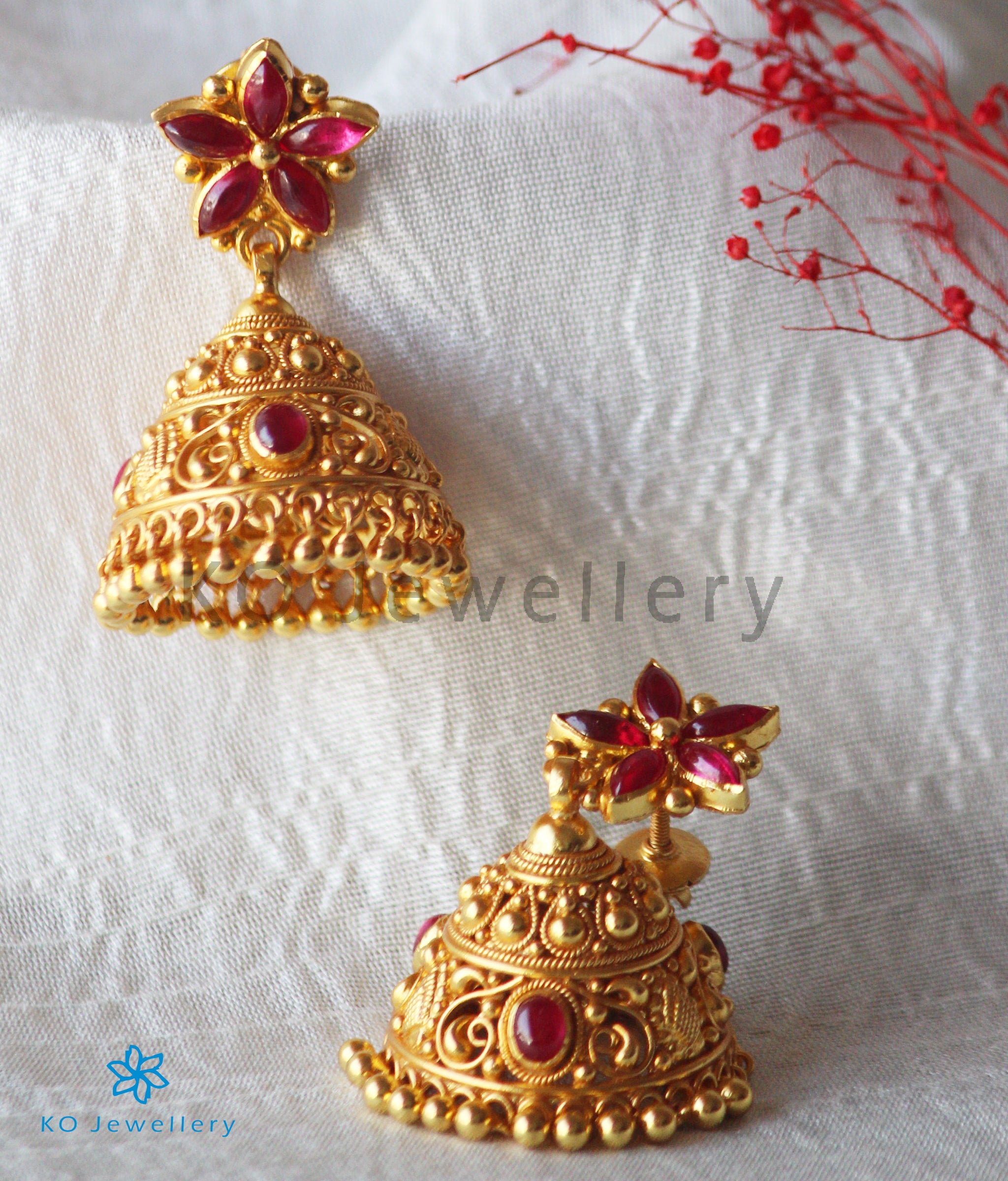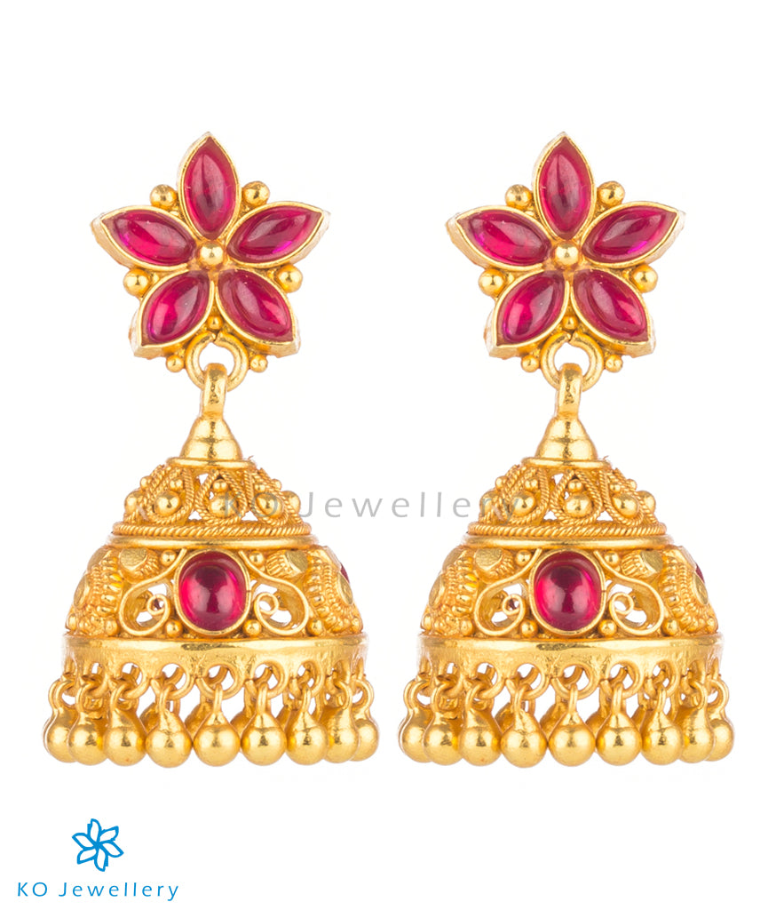 Wear a pretty pair of fully red, kempu-studded jhumka that has a blooming flower in the ear-stud. The finely-detailed jhumkas inspired by ancient South Indian gold temple jewellery, are handcrafted from Sterling Silver (92.5%) and gold-dipped to create an unforgettable piece of jewellery. The pair comes with bombay-screw .