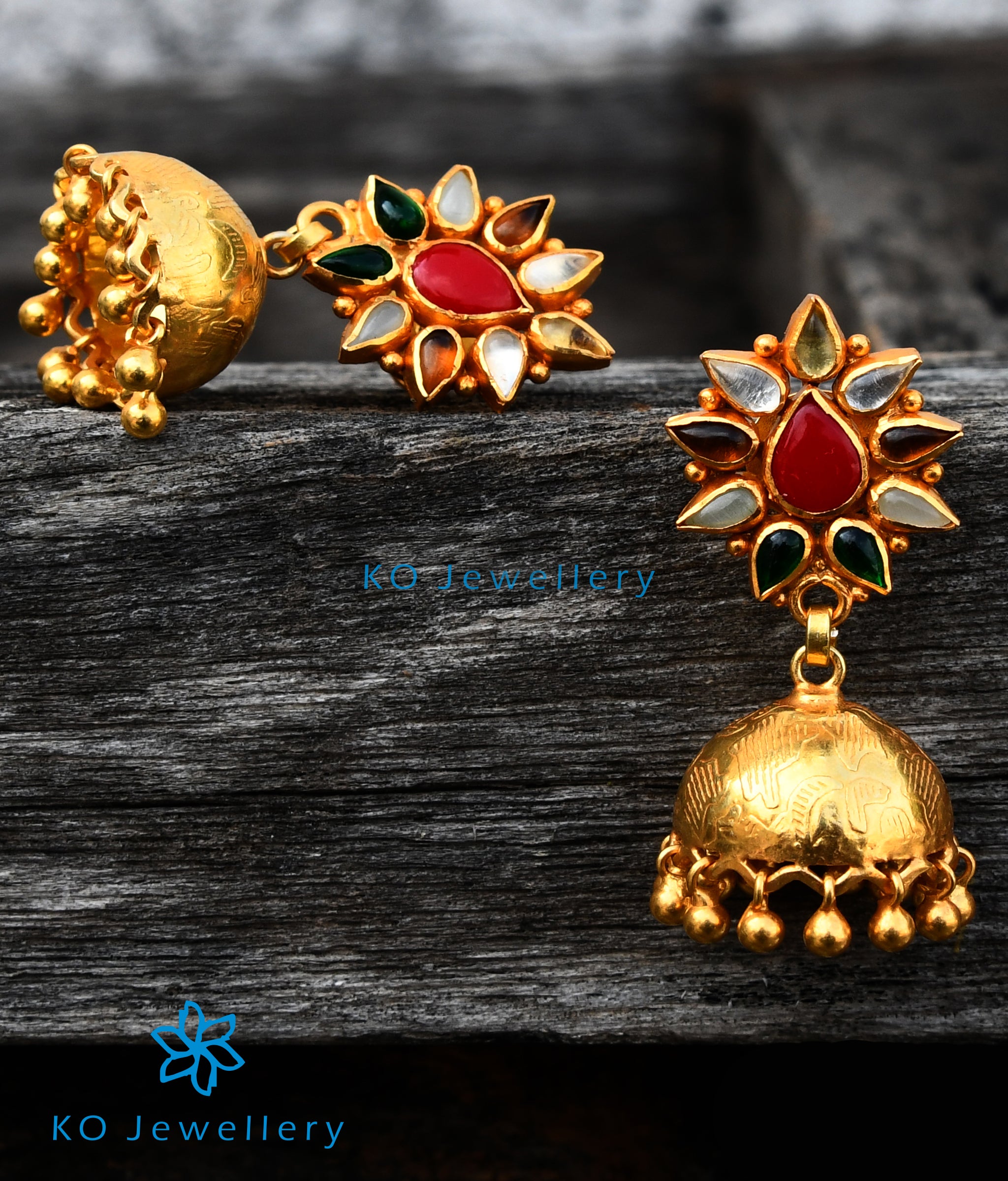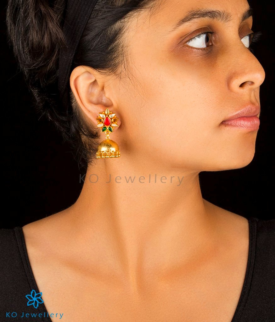Colourful and vibrant, just the right accessory for the festive season. This pair of Sterling Silver (92.5%) jhumkas with a navaratna ear-stud is crafted using techniques used in ancient South Indian antique gold temple jewellery and gold-dipped.