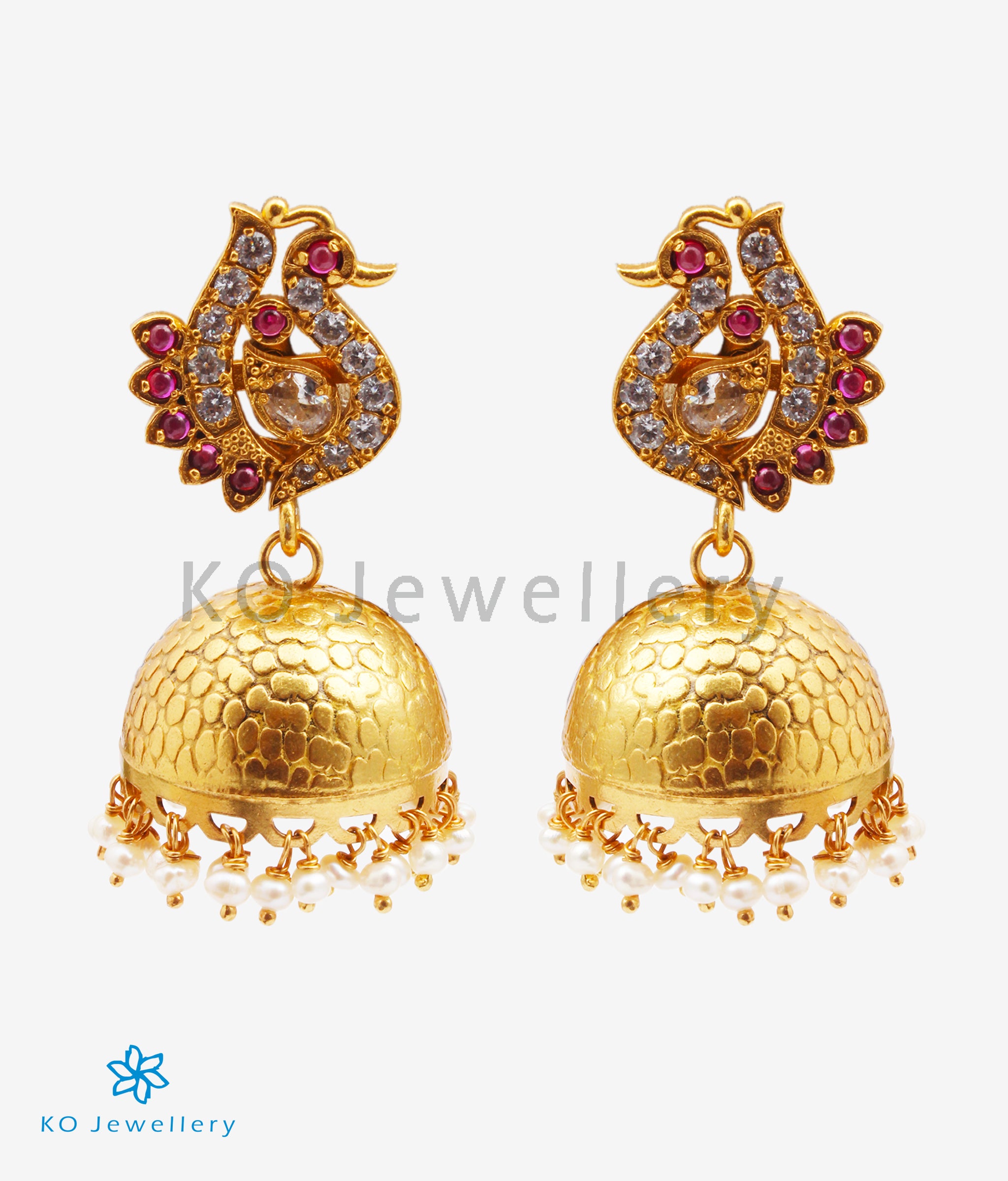 Simply gorgeous, this pair of ornate and attractive jhumkas will attract attention. The peacock motif ear-stud is studded with `kempu' stones and it is accompanied by a plain golden jhumka.Crafted in the finest traditions of ancient south Indian temple jewellery this jhumka is handcrafted in sterling silver (92.5%) and gold dipped to perfection.It comes with a bombay screw at the back .