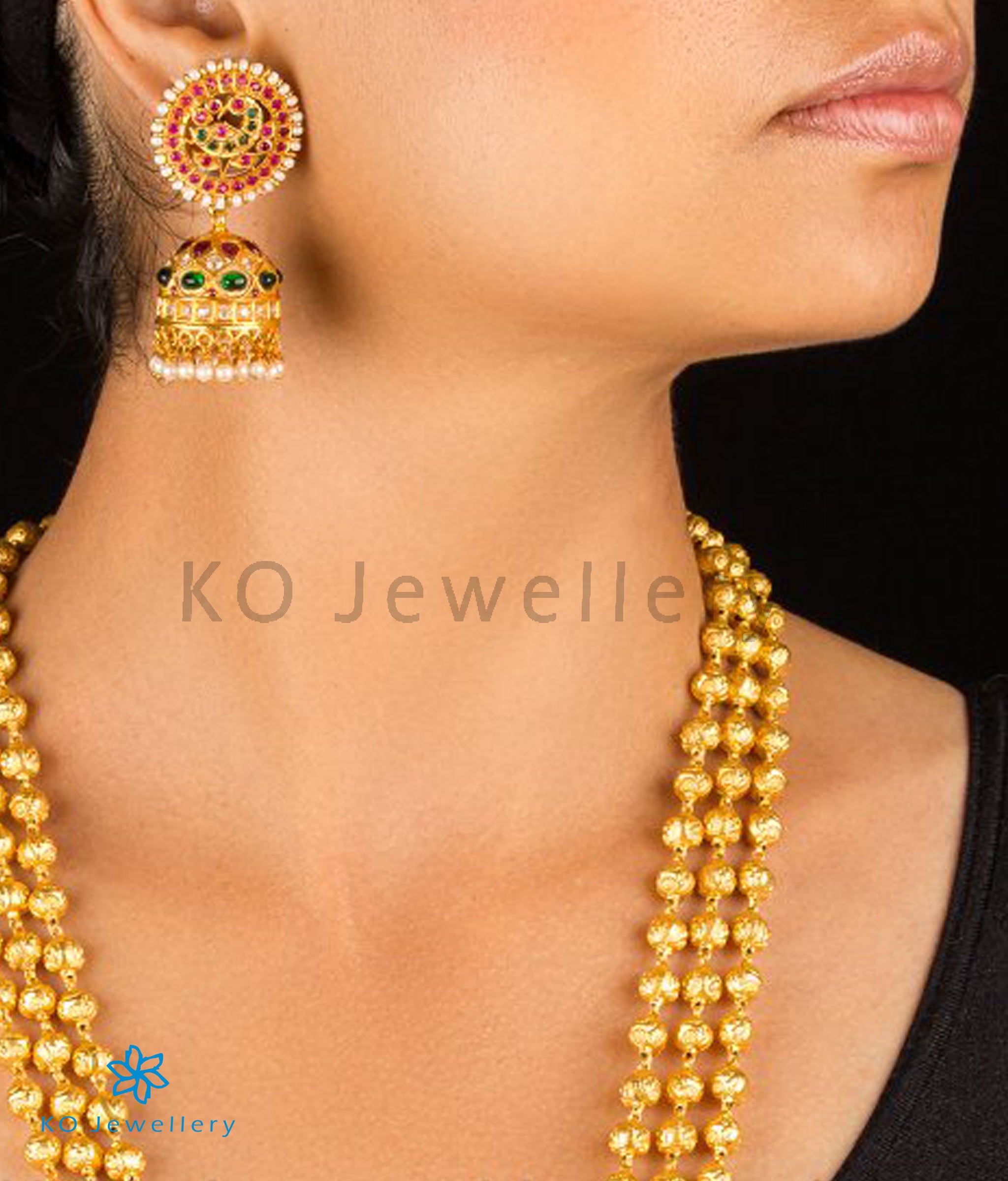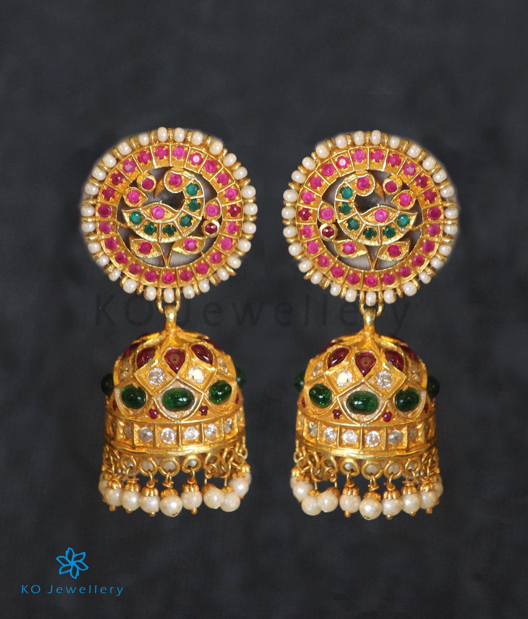 Celebrate the beauty of the peacock with this stunning pair of peacock- jhumkas, lovingly handcrafted from Sterling Silver (92.5%) and decorated with kempu stone and Pearl. Handcrafted using techniques of south indian temple jewellery and gold-dipped to accentuate the intricate design, this gorgeous pair features a finely designed peacock on the ear stud, from which hangs a ornate jhumka with intricate patterns.