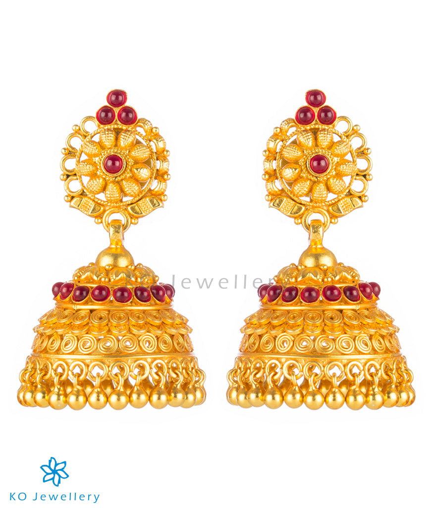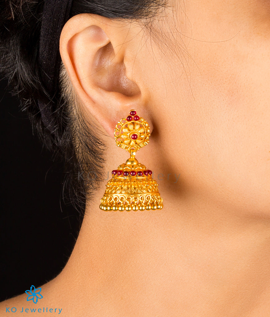 Intricately handcrafted jhumkas with a kempu stone ear-stud this pair will surely put a glow on your face. Crafted using techniques used in ancient South Indian antique gold temple jewellery the entire piece is crafted in Sterling Silver (92.5%) silver and gold-dipped. This jhumki comes with a bombay-screw)