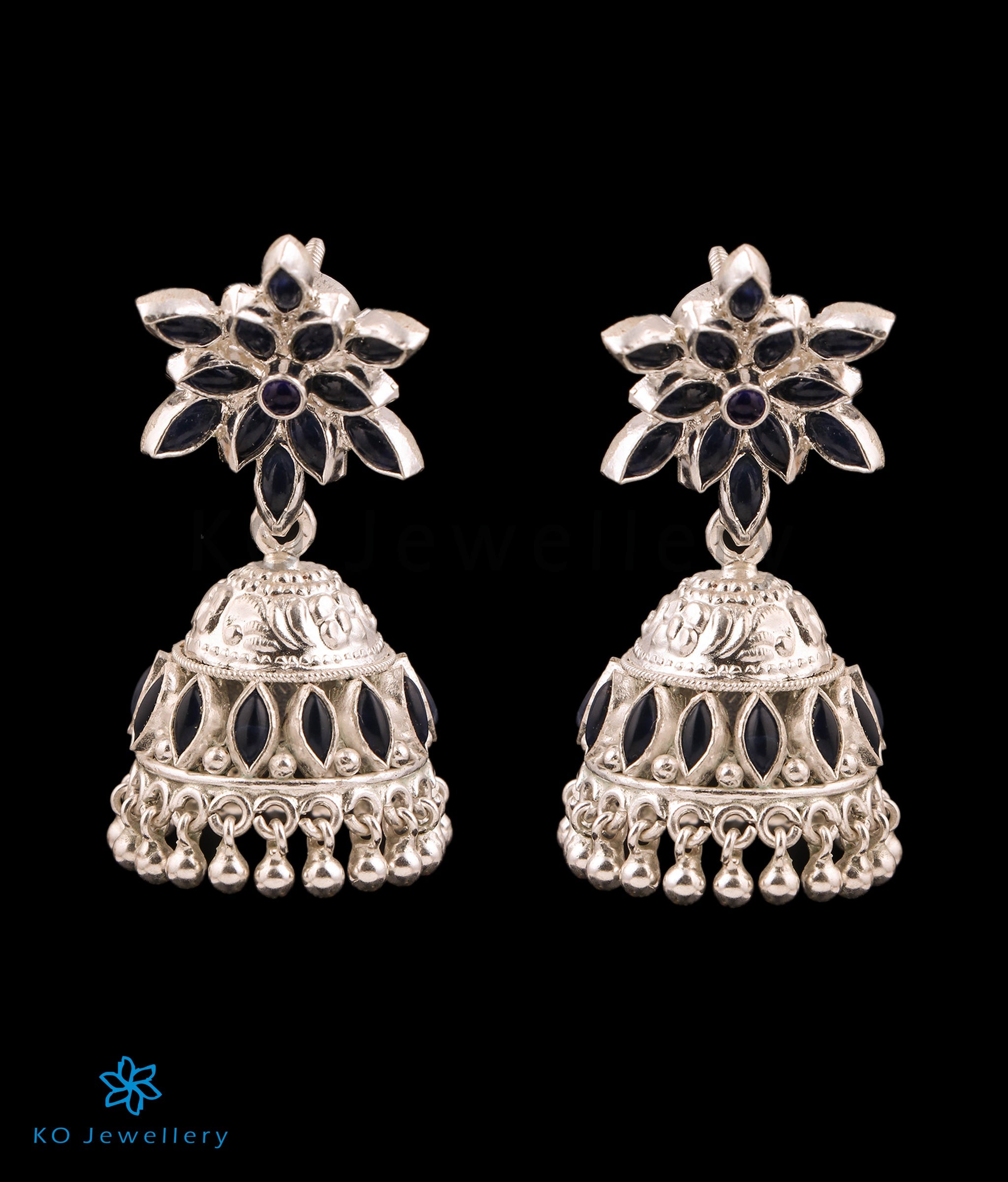 A gorgeous pair of jhumkas inspired by the lotus design. The Lotus is a symbol of divine beauty, purity and is an oft used motif in jewellery .Crafted using techniques used in ancient South Indian antique gold temple jewellery the jhumkas are crafted in pure Sterling Silver (92.5%) and oxidised. The blue kempu stones add a touch of colour .