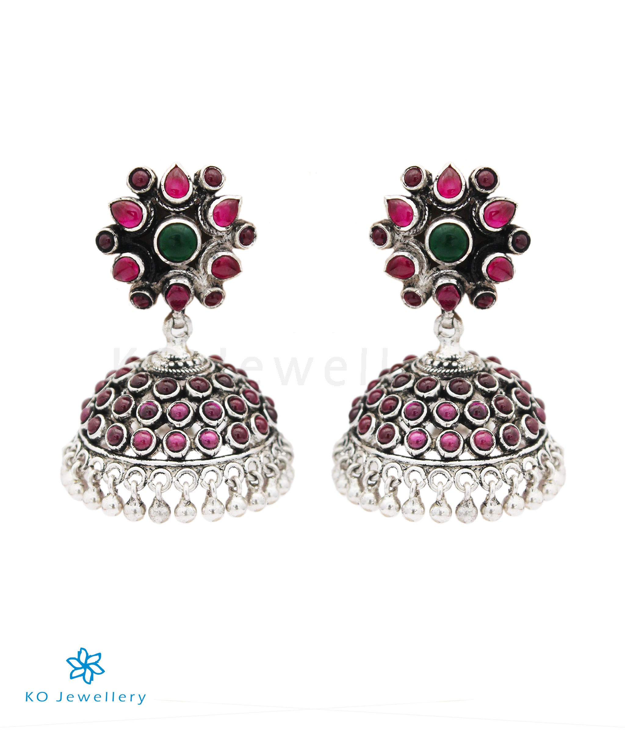A sterling silver (92.5%) jhumka handcrafted to perfection , decorated with kempu stones.The floral ear-stud makes this jhumka more attractive while the beautiful jhumka which is crafted out of pure silver and decorated with kempu stones has a lyrical beauty of its own.