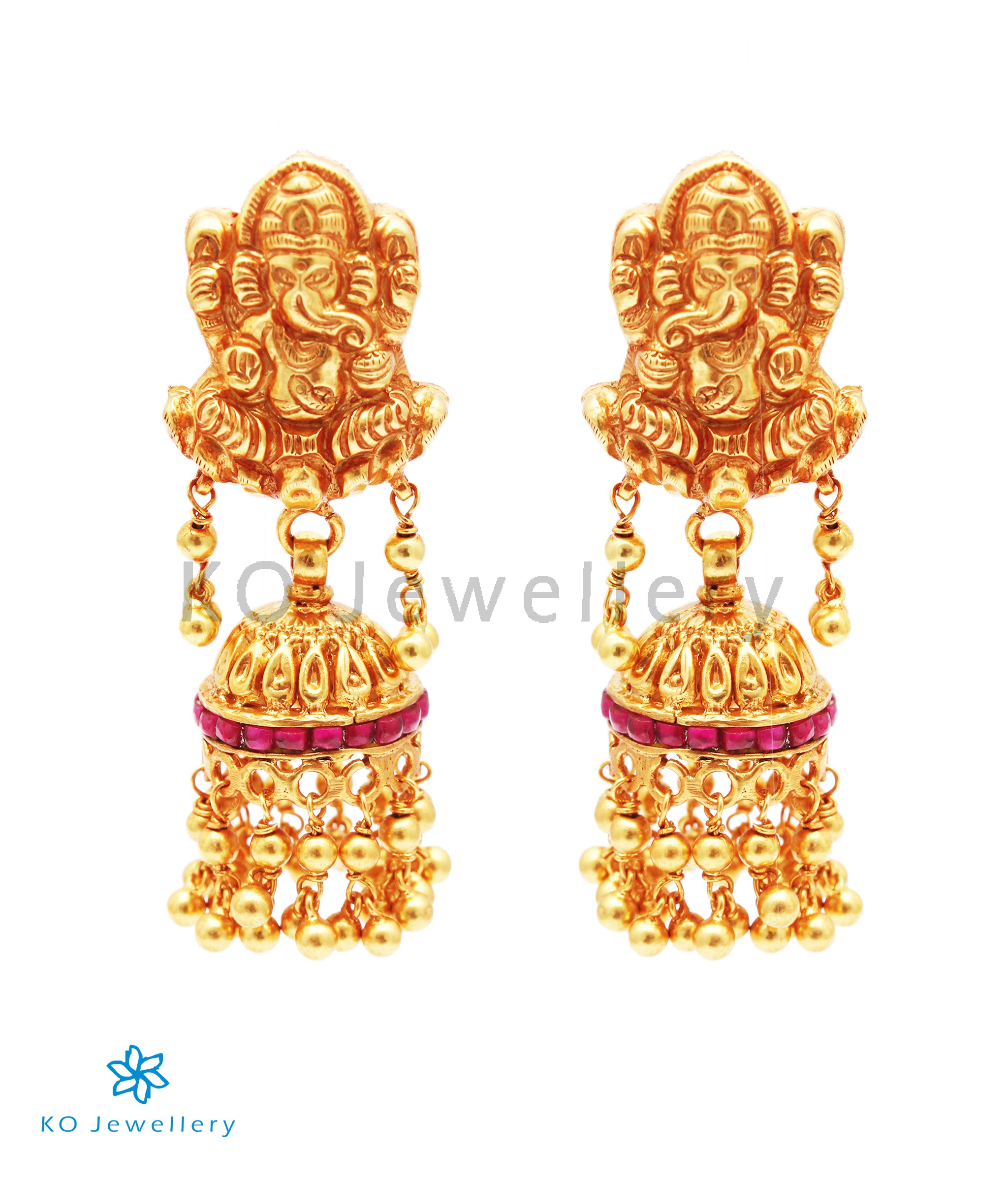 Its hard to take your eyes off this pair of ornate and attractive jhumkas. The impeccably handcrafted nakkasi Ganesha ear-stud at the top is accompanied by a small jhumka. Crafted in the finest traditions of ancient south Indian temple jewellery this jhumka is handcrafted in sterling silver (92.5%) and gold dipped to perfection.