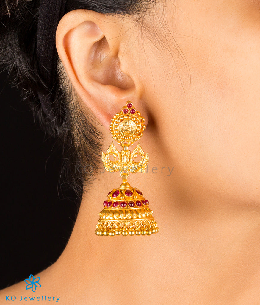 A pretty pair of silver jhumkas with Lakshmi motif earstuds, handcrafted from Sterling Silver (92.5%) using the techniques employed for ancient South Indian gold temple jewellery. The beautiful pair features a twin peacocks and a kempu stone studded jhumka. The pair is dipped in 24-karat gold to bring out the design and features a bombay-screw for easy wearability. Couple it with your favourite sari to make heads turn.