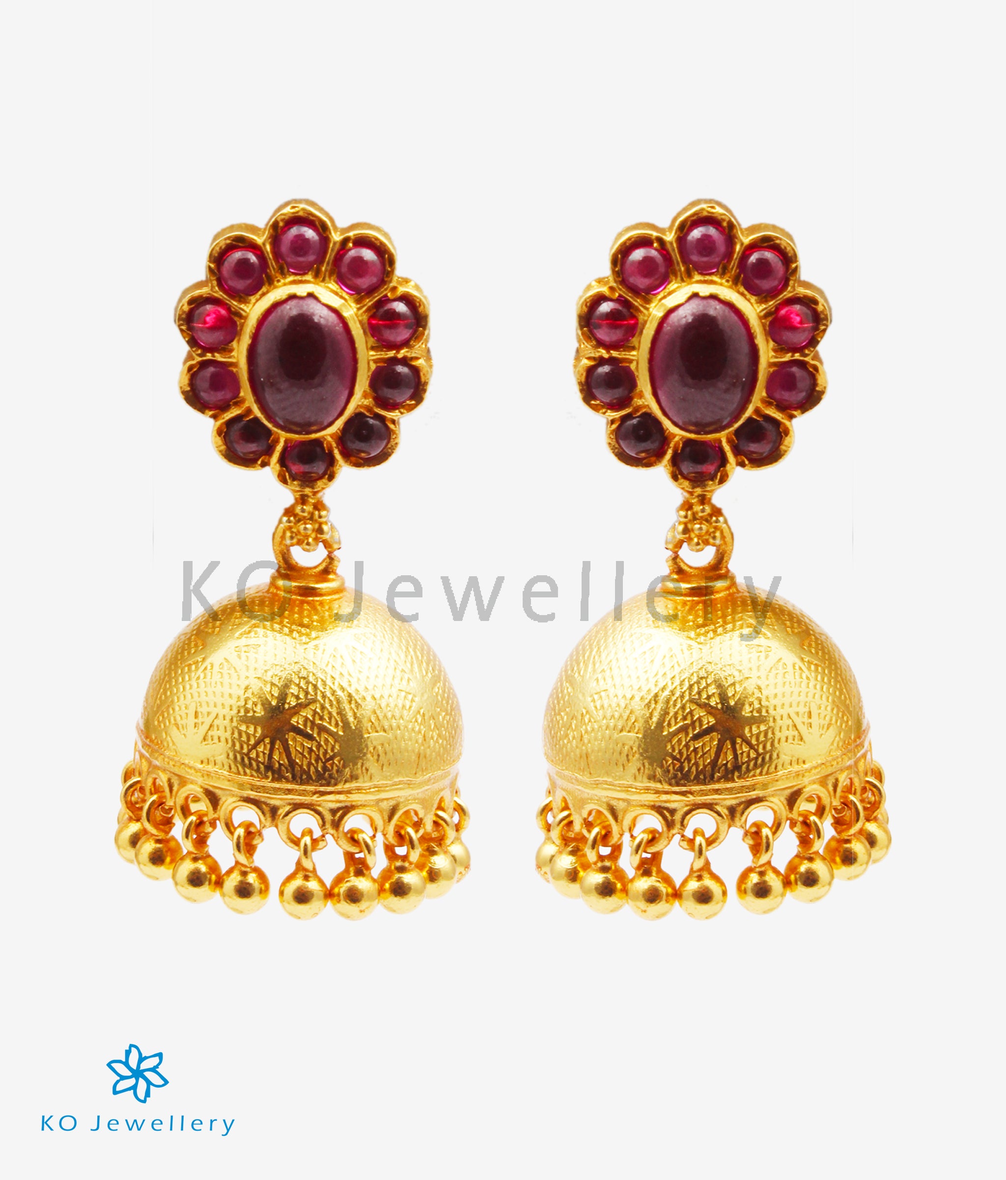 An attractive pair with flower shaped kempu stone ear-studs and a plain jhumki hanging below. Handcrafted in Sterling silver (92.5%) and gold-dipped to perfection this pair is neither too big nor too small and comes with a bombay screw at the back .