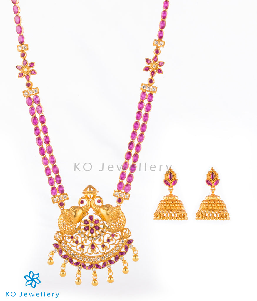 Fit to adorn a bride, this ornate and lengthy necklace with two layers of kempu stones is truly a head-turner.The center-piece of the necklace is its pendant that carries two elephant-heads.Crafted using techniques used in ancient South Indian antique gold temple jewellery the entire piece is crafted in pure silver and dipped in 24 karat gold.It is paired with matching jhumkas.