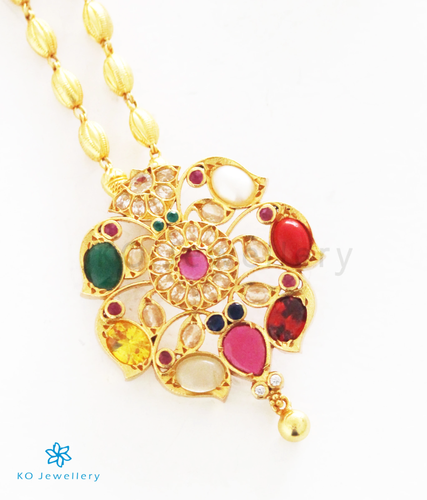 Navaratna gemstones - the quintessential protection stones that bring luck and welcome the auspicious. Classic and traditional in design, this is an impeccably handcrafted necklace in Sterling Silver (92.5%) which has been gold-dipped.