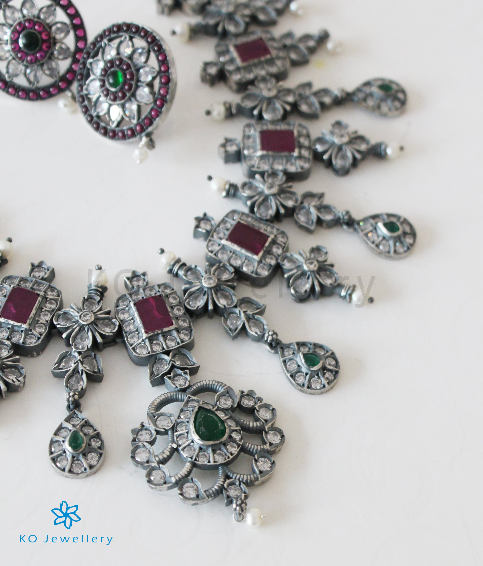 Catch everyone's attention with this bejewelled beauty crafted in Sterling Silver (92.5%) and studded with premium red/ green and white Zircon.Crafted using techniques used in ancient South Indian antique gold temple jewellery the entire piece is crafted in pure silver .