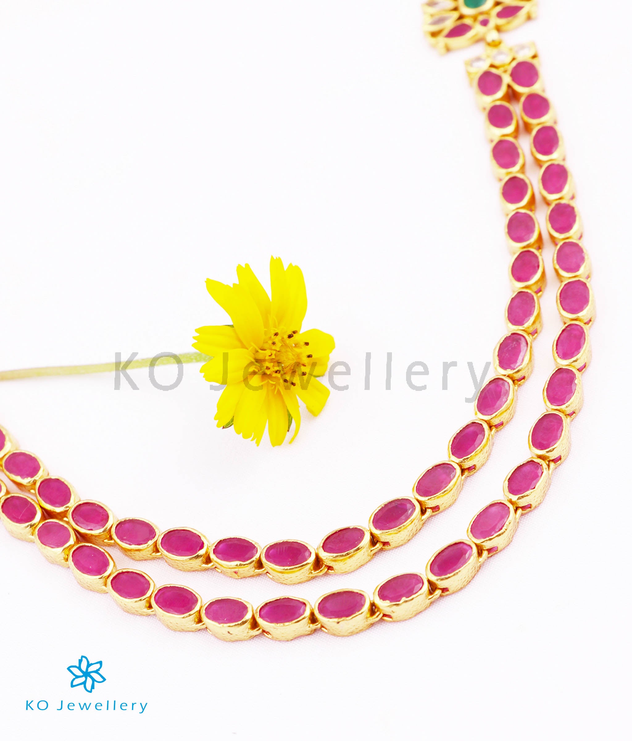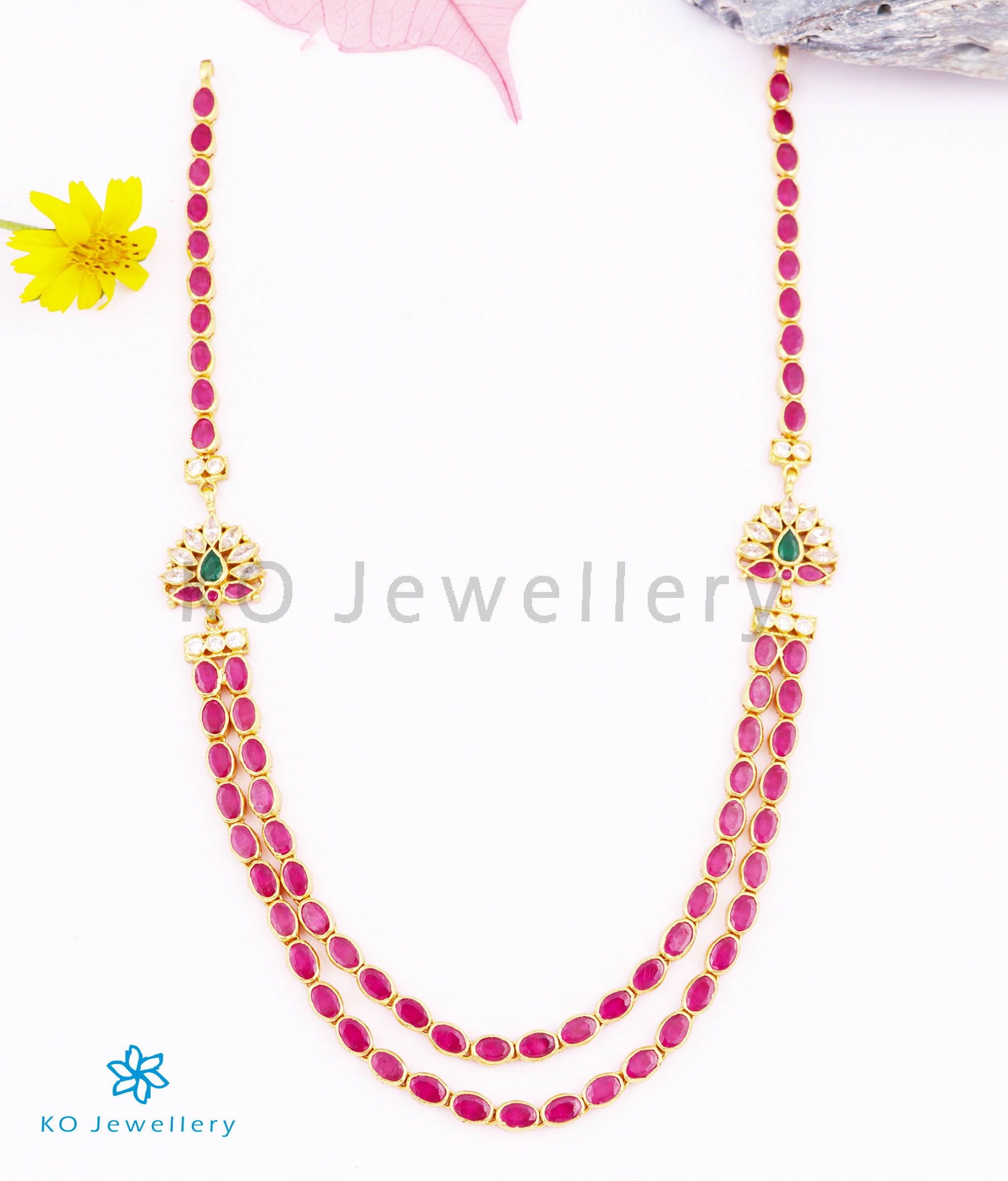 Look stunning in this lovely two layered necklace studded with red and green kempu stones.The elaborate design is combined with flawless craftsmanship to make it a stunning piece. All pieces in this collection are crafted in Sterling (92.5) Silver and gold-dipped in a special process to give them an antique look.