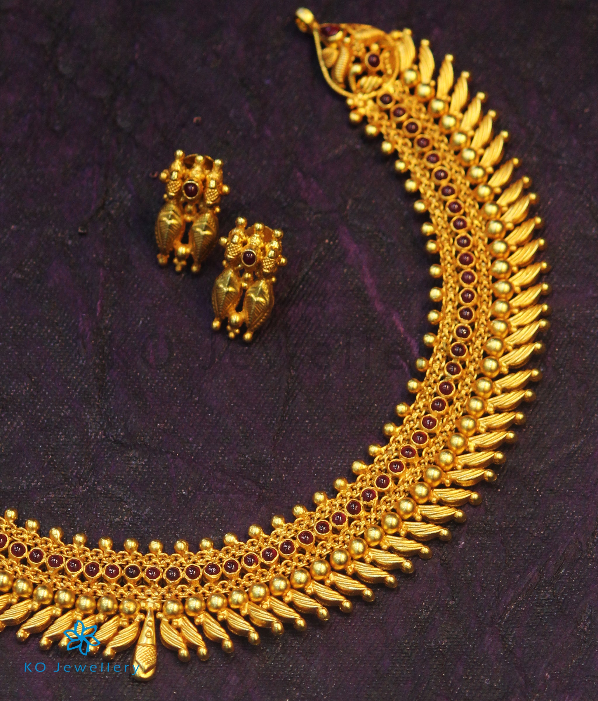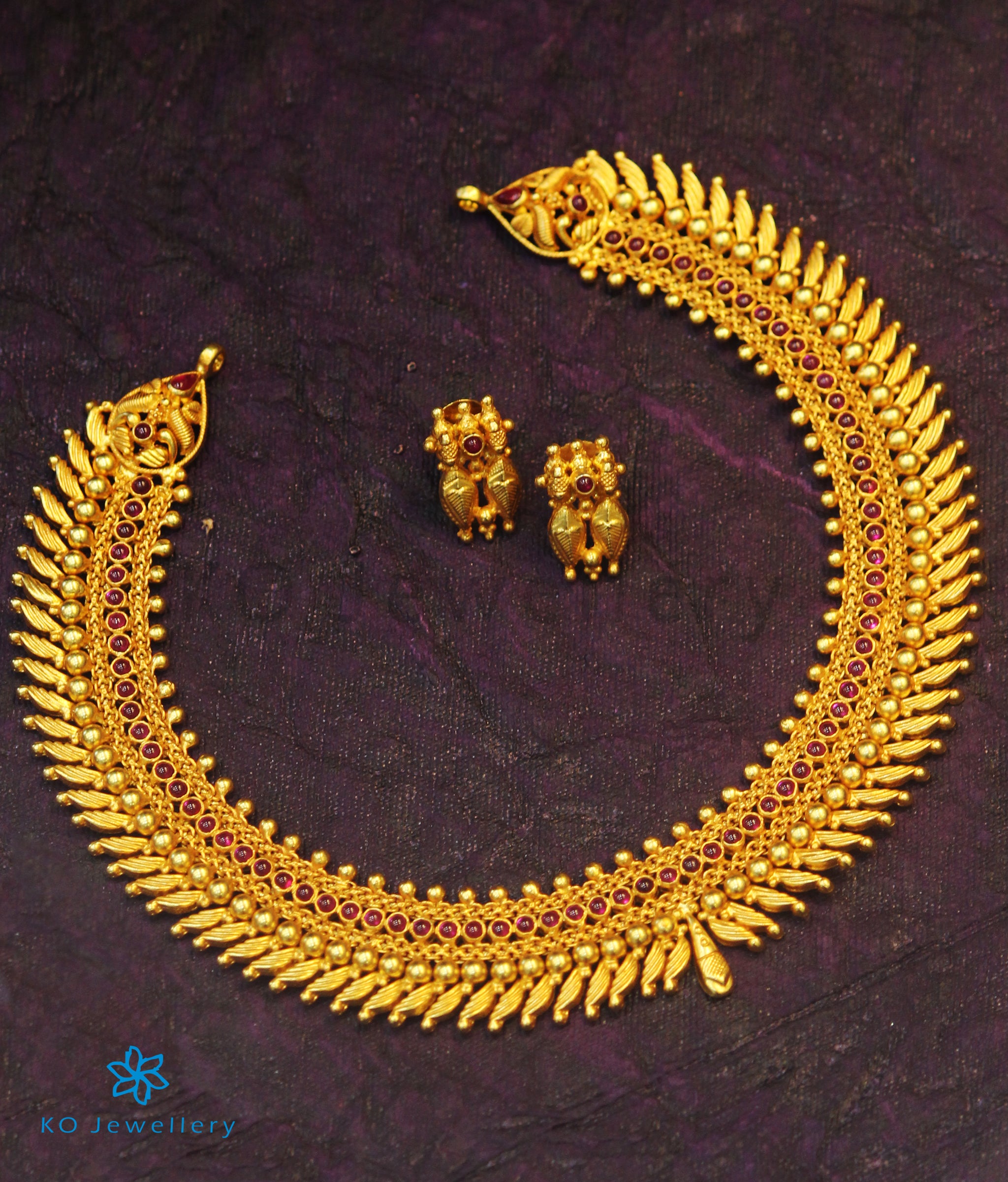 A gorgeous choker-necklace in a traditional design ,this piece sits beautifully around your neck.Crafted using techniques used in ancient South Indian antique gold temple jewellery the entire piece is crafted in pure Sterling Silver (92.5%) and dipped in 24 karat gold.The kempu stones add a touch of colour .This necklace can be paired with matching ear-studs.