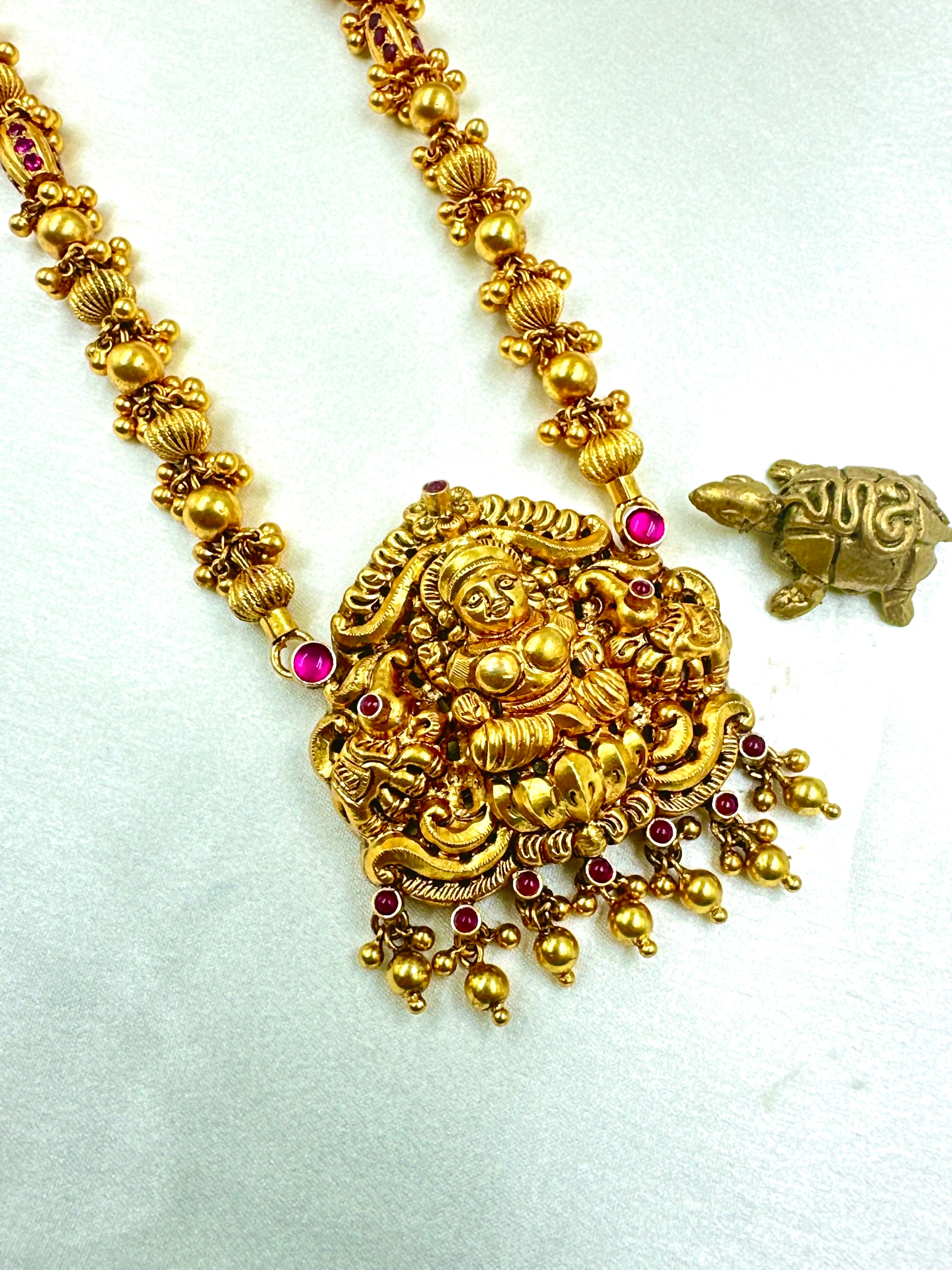 Handcrafted using techniques used in ancient South Indian antique jewellery and studded with tiny kempu stones it is gold-dipped in a special process to give an antique look.