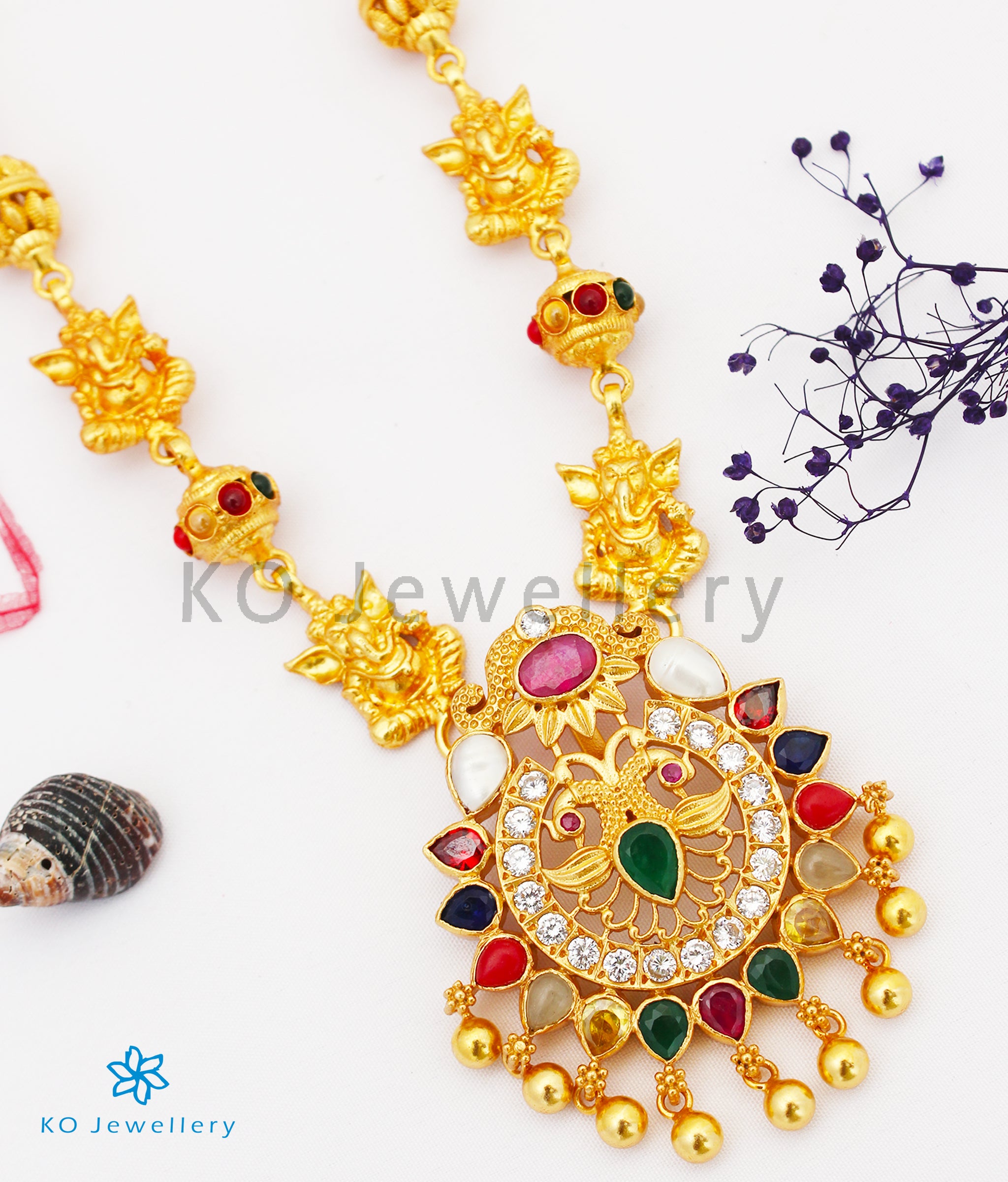 This necklace is made up of gold-dipped, beads and Ganesha motifs and has an attractive twin peacock motif pendant with navratna gemstones . Handcrafted fully Sterling Silver (92.5%) this is a stunning piece of jewellery.