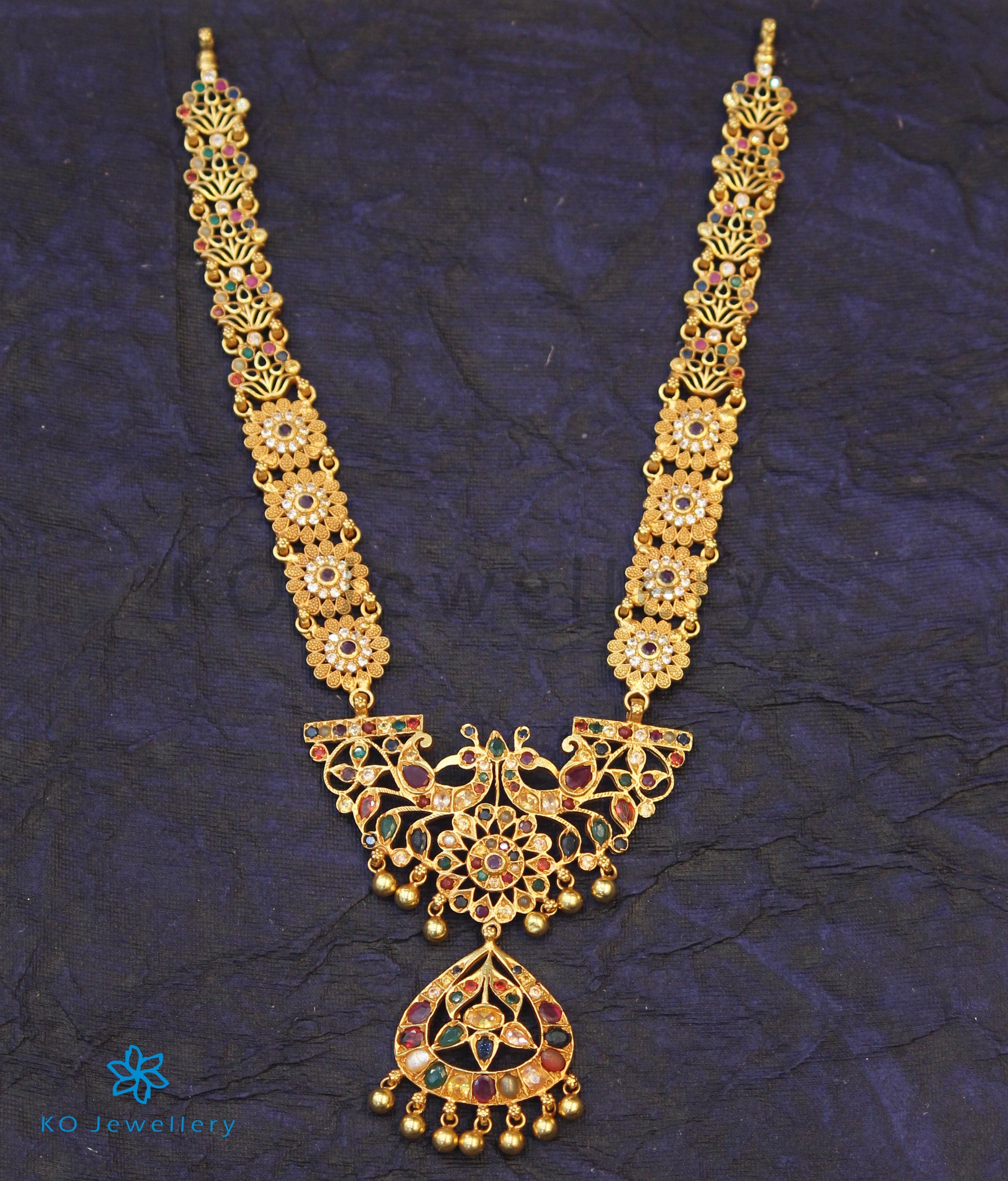 An ornate navartna stone necklace in gold-dipped Sterling Silver (92.5) ; this necklace uses the `Makarakanti' design - a ceremonial necklace worn by kings in ancient times. The pendant has two peacocks etched in fine detail facing each other, while the necklace string is intricate .