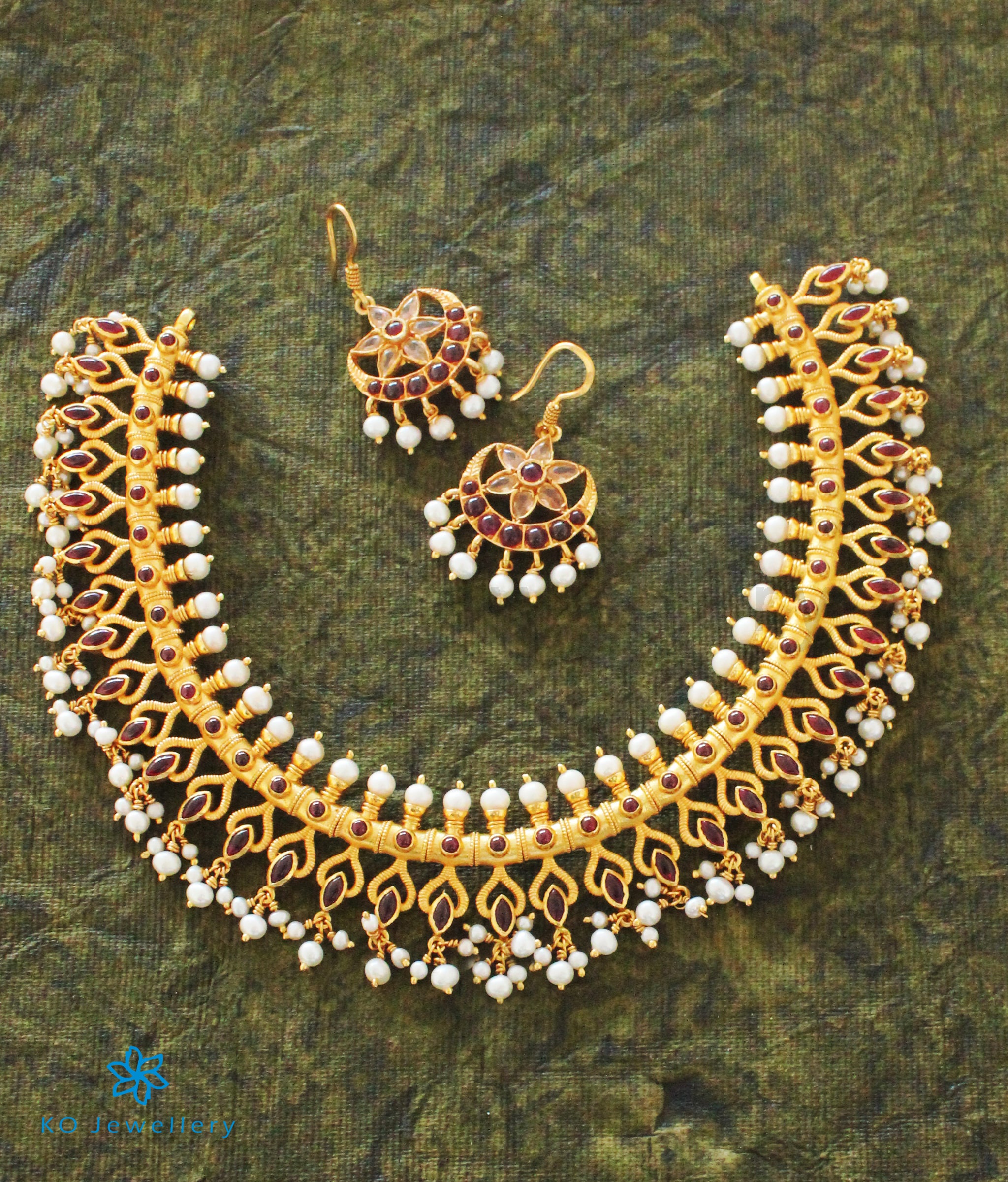 A gorgeous choker-necklace in an ornate design ,this piece sits beautifully around your neck.Crafted using techniques used in ancient South Indian antique gold temple jewellery the entire piece is crafted in pure Sterling Silver (92.5%) and gold-dipped.The kempu stones and pearls add a touch of elegance.This necklace is paired with a beautiful pair of earrings in the same design.