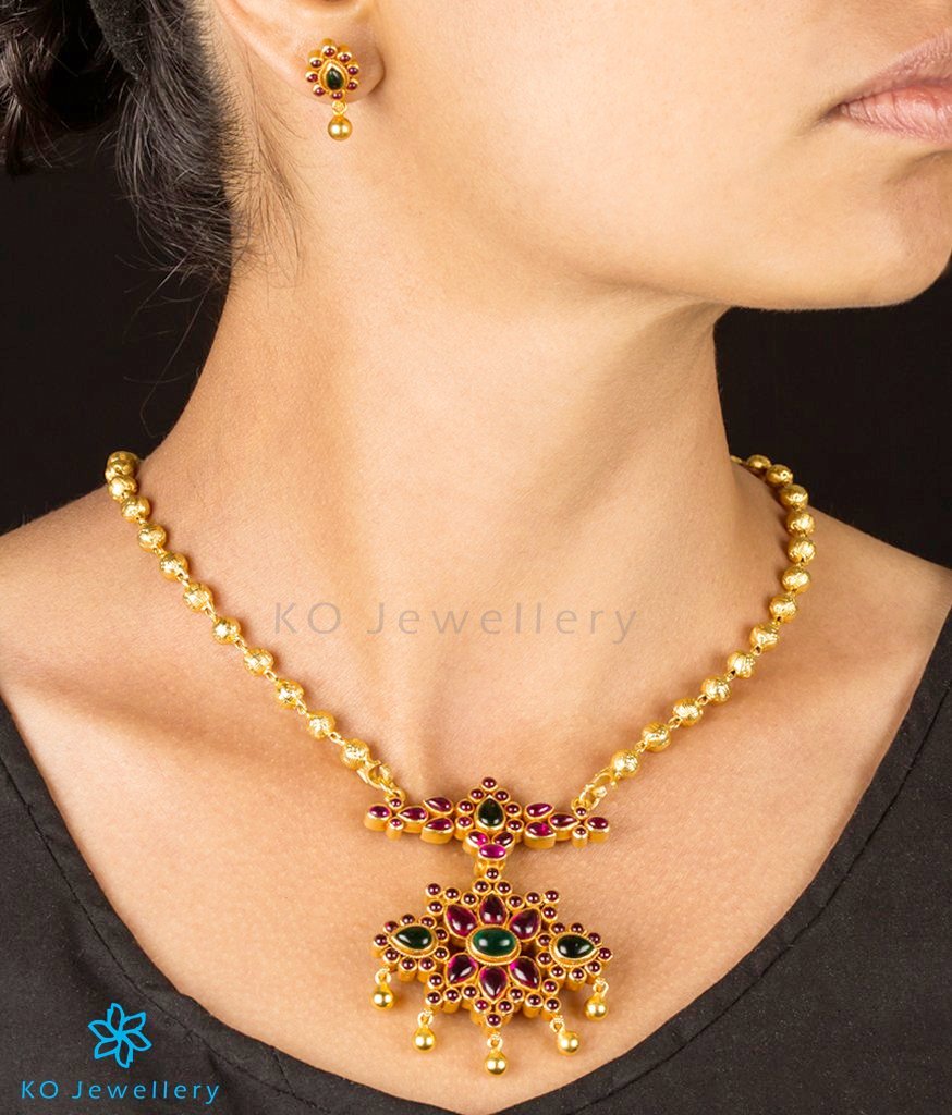 This is a `reversible' Sterling Silver (92.5%) necklace studded with red and green kempu stones. On one side it is studded with red colour stones with a green center and the same design is reversed on the other side with green colour . So you get to experience the convenience of wearing either red or green.