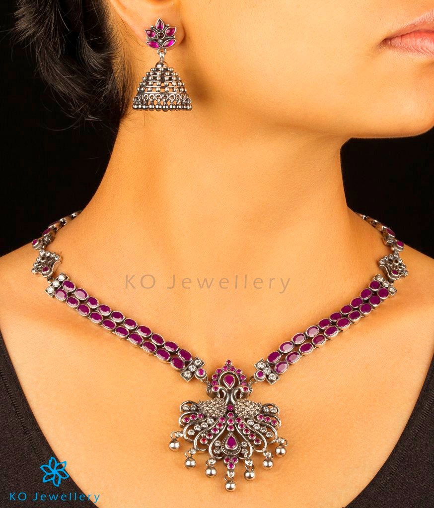 This ornate and lengthy necklace with twin peacocks and two layers of kempu stones is truly a head-turner.The center-piece of the necklace is its pendant that carries two peacocks finely detailed with kempu stones. Crafted using techniques used in ancient South Indian antique gold temple jewellery the entire piece is crafted in pure silver and oxidised.It is paired with matching jhumkas.