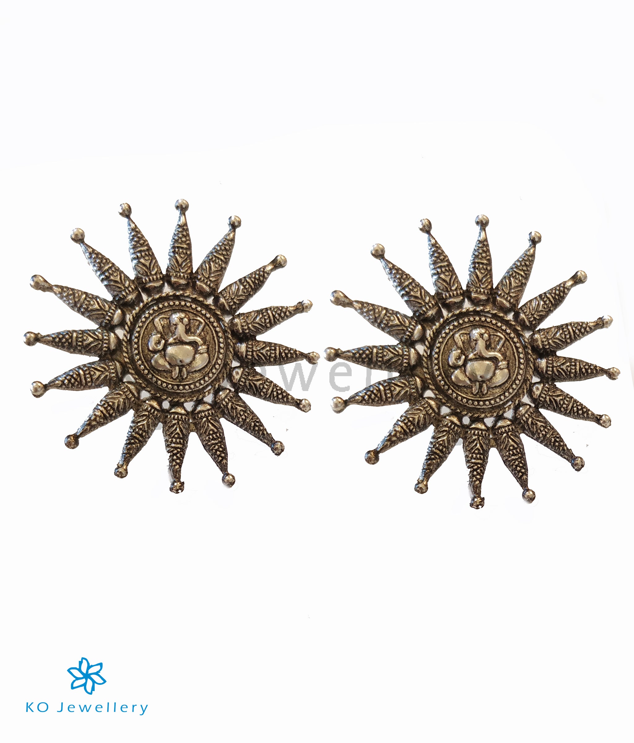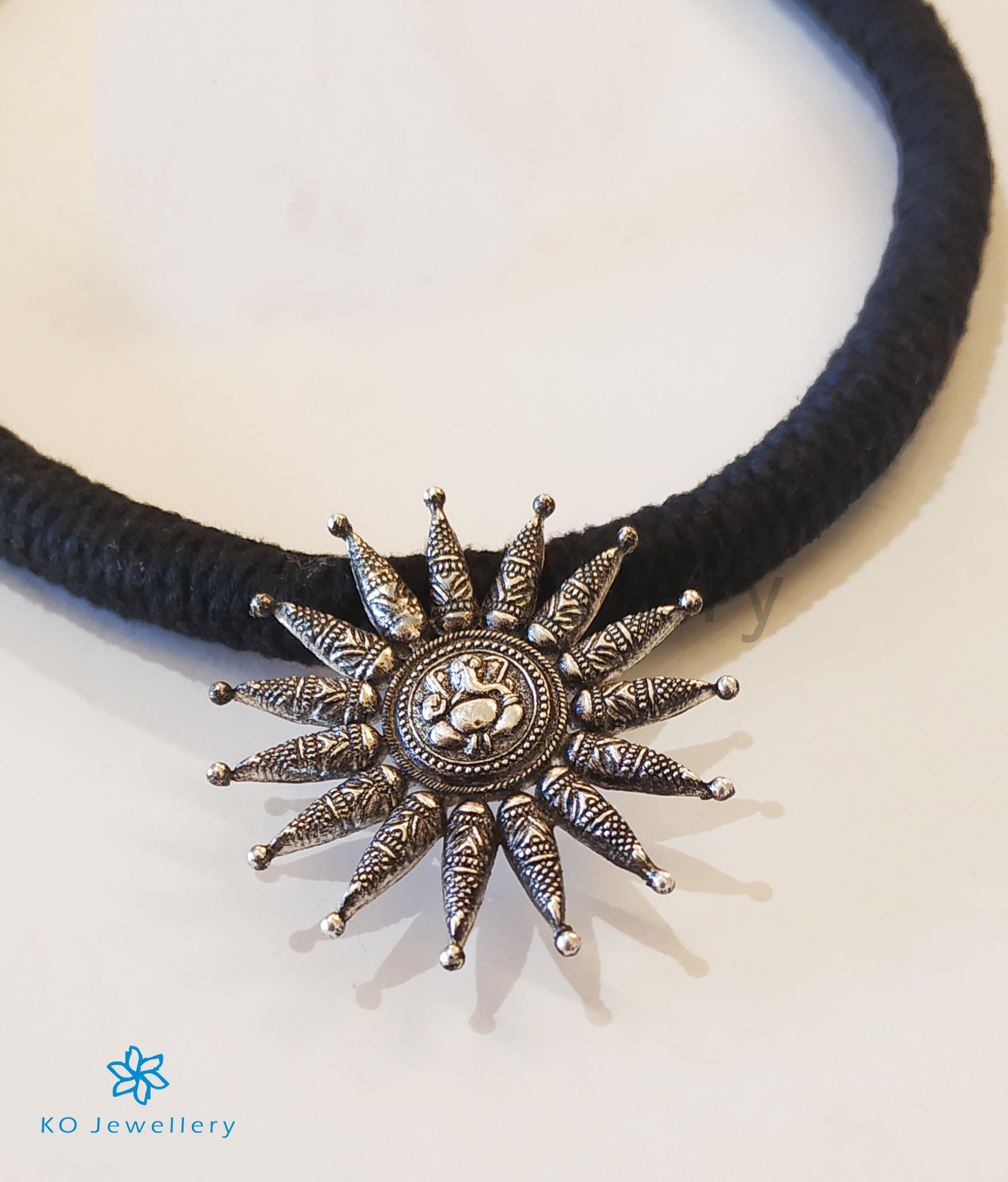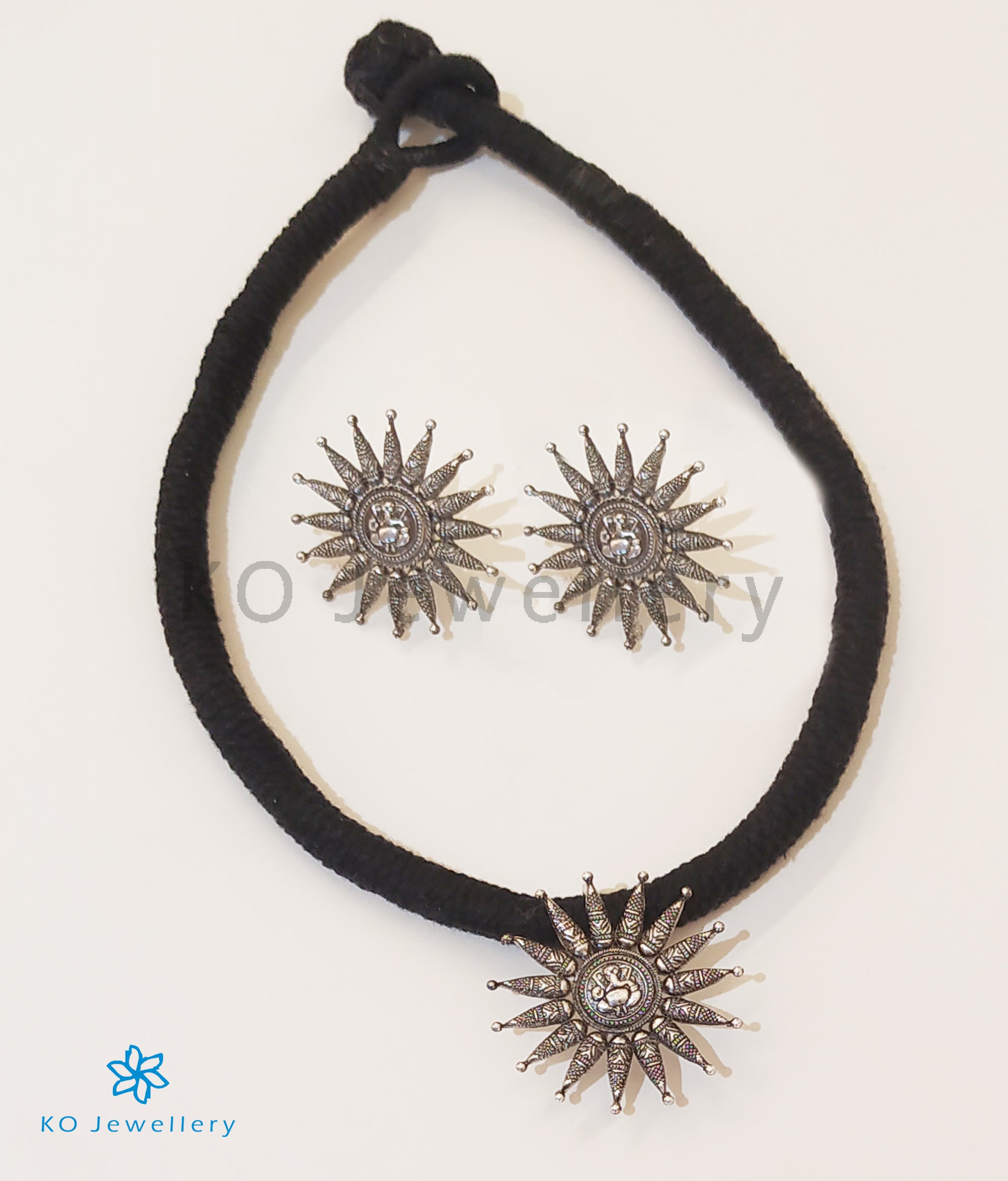 A attractive pendant-earrings set with a beautiful Ganesha motif in the center that can be paired with ethnic attire or sarees. It comes with a pair of matching ear-studs and is fixed on a black cotton handwoven thread. All three pieces are crafted in Sterling Silver (92.5%) using techniques used in ancient South Indian antique gold temple jewellery.