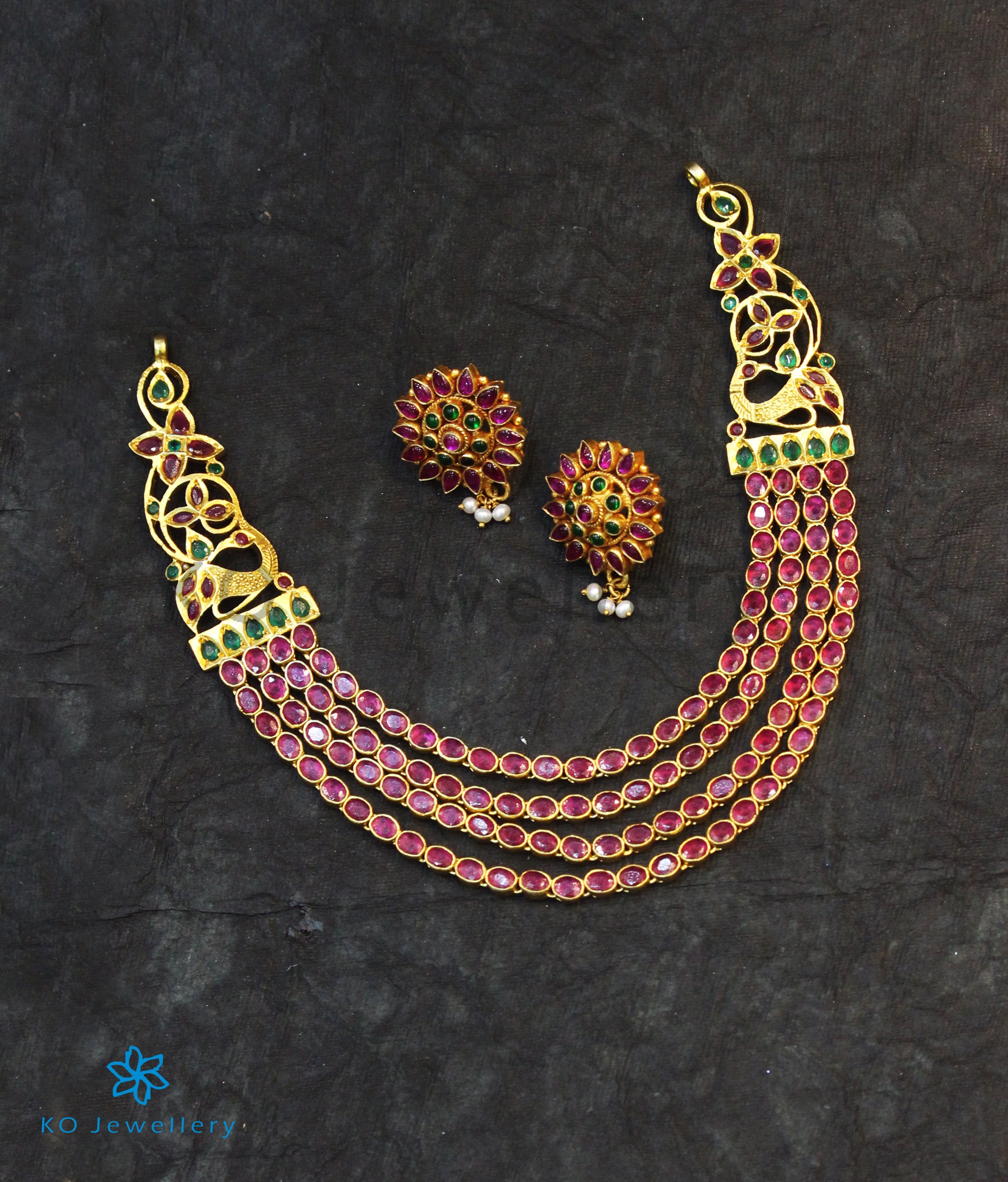 This is a gorgeous peacock motif necklace with four rows of kempu stones held up by a peacock-clasps on either side.Handcrafted with care in pure Sterling Silver (92.5%) with techniques used in ancient South Indian antique gold temple jewellery, the entire piece has been gold-dipped.It has been paired with ear-studs.