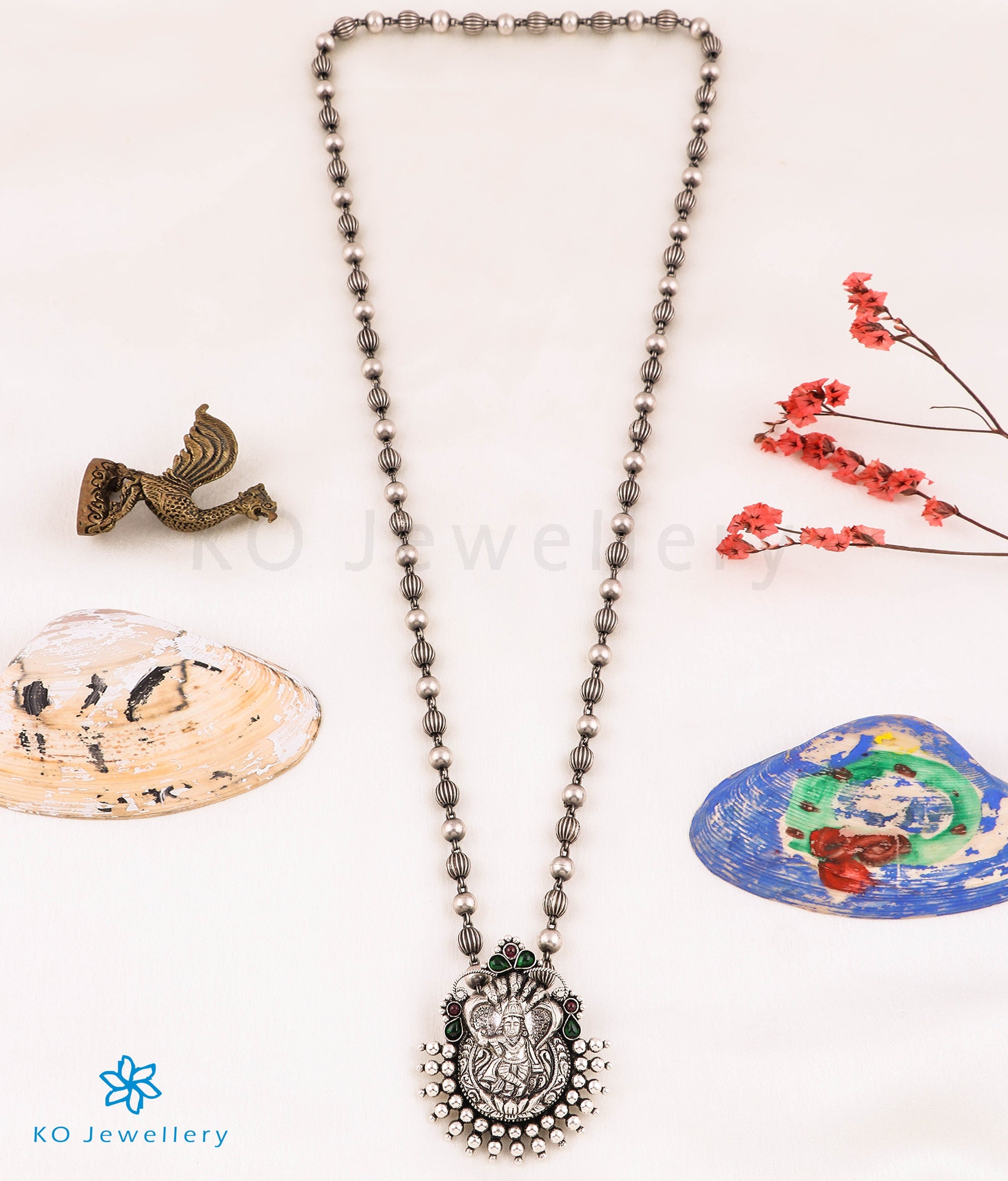 A traditional design pendant with the image of lord Krishna that is handcrafted using techniques used in ancient South Indian antique gold temple jewellery . The entire piece is crafted in pure Sterling Silver (92.5%) .