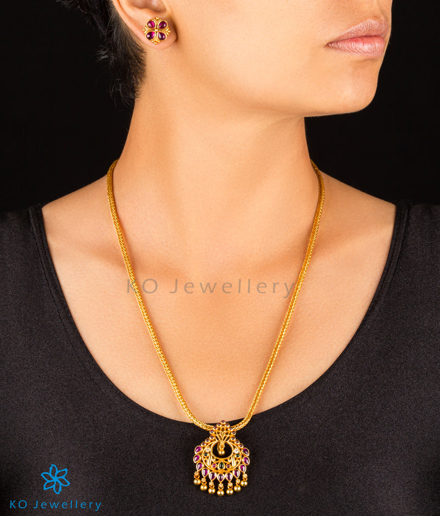 A beautiful heart shaped pendant with an ornate design decorated with kempu stones.Handcrafted in Sterling Silver (92.5%) this gold-dipped pendant is made using techniques used in ancient South Indian antique gold temple jewellery .The pendant is detachable and is hung on a chain and paired with matching kempu stone ear-studs.