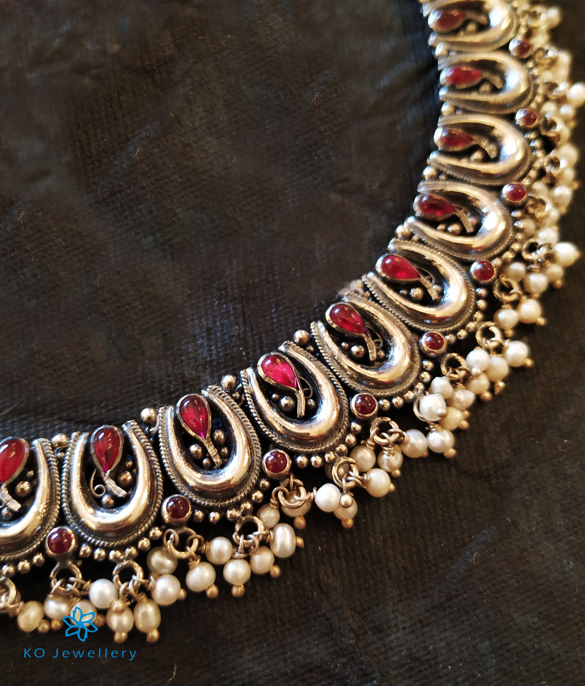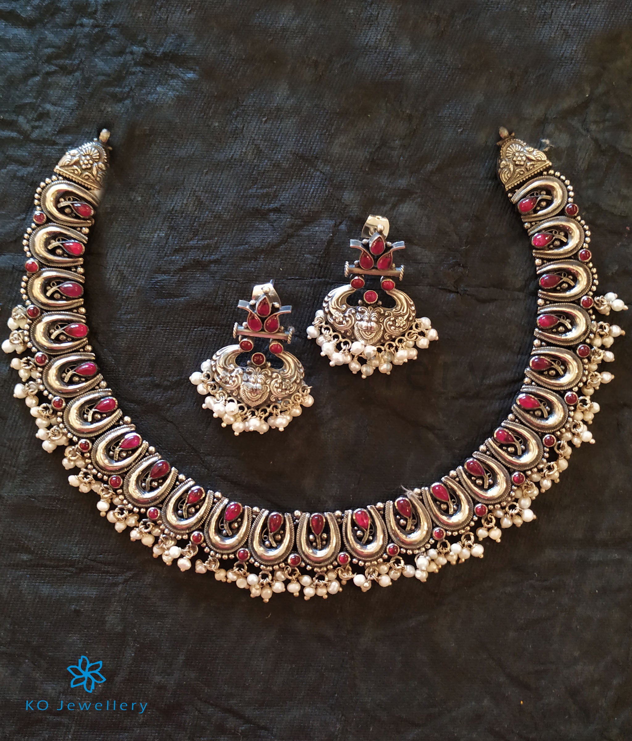 A gorgeous choker-necklace in an ornate design ,this piece sits beautifully around your neck.Crafted using techniques used in ancient South Indian antique gold temple jewellery the entire piece is crafted in pure Sterling Silver (92.5%) and oxidised .The kempu stones and pearls add a touch of elegance.This necklace is paired with a beautiful pair of earrings.