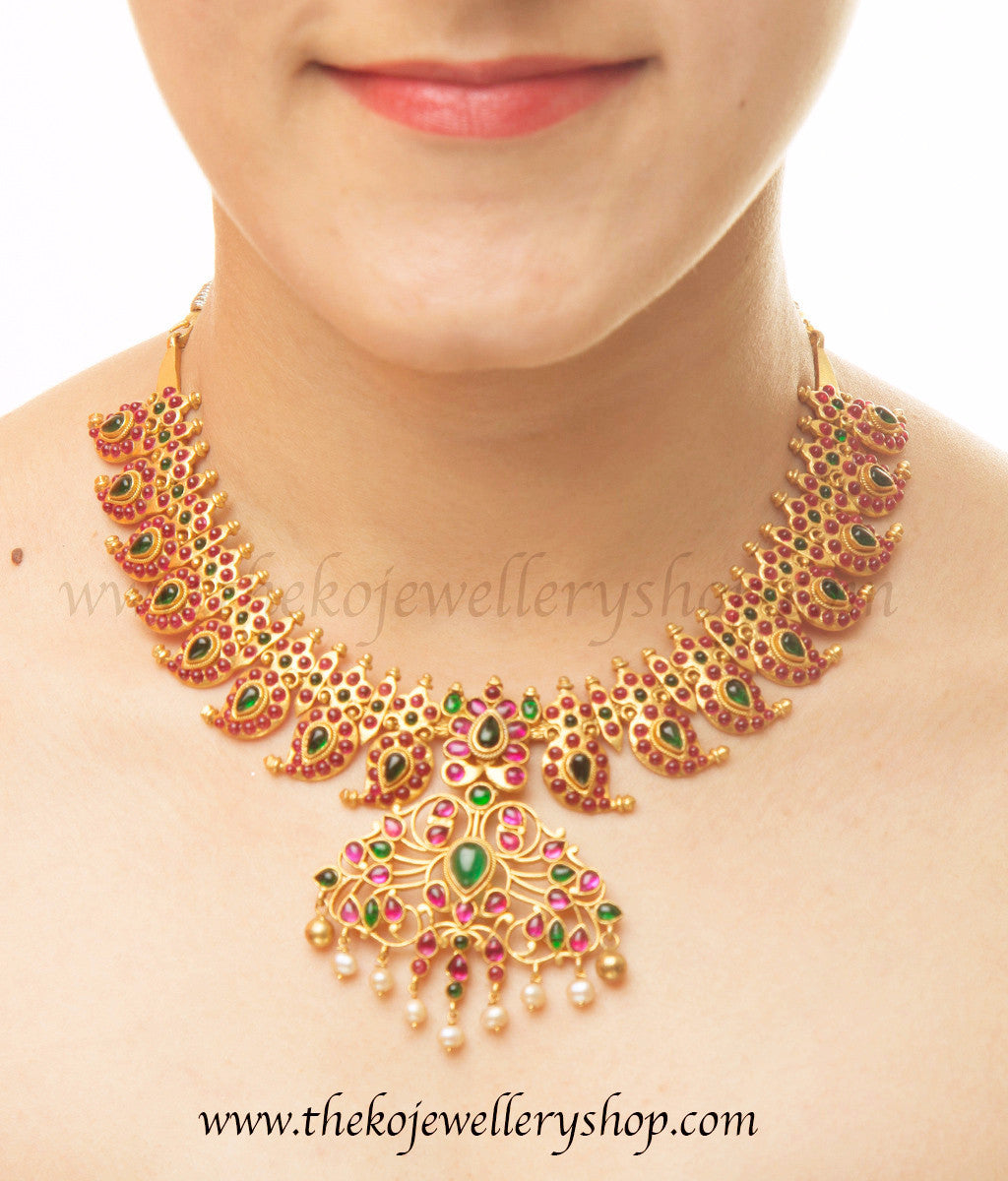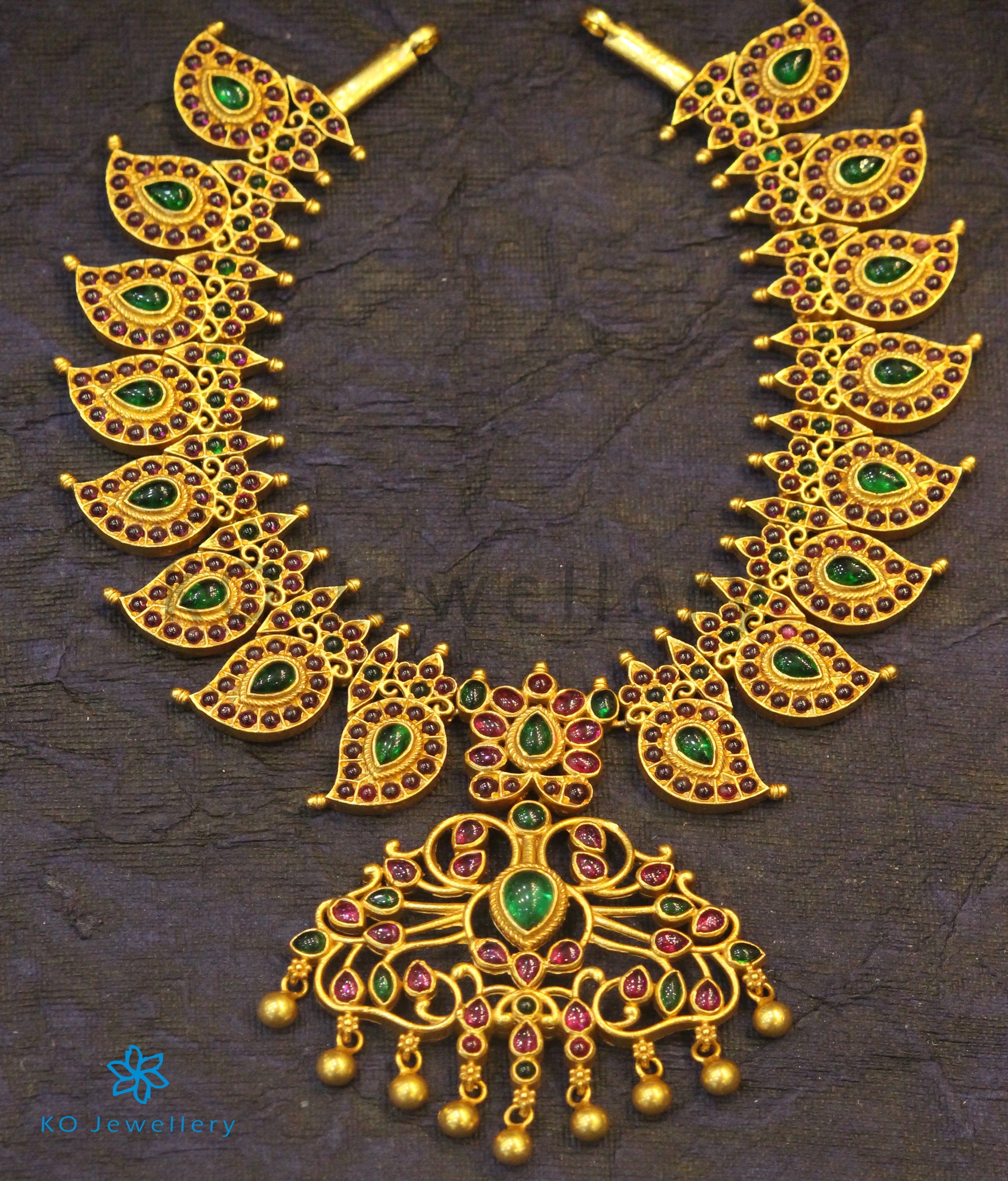 Handcrafted using techniques used in ancient South Indian antique jewellery and studded with `kempu' (red) stones it is gold-dipped in a special process to give an antique look.