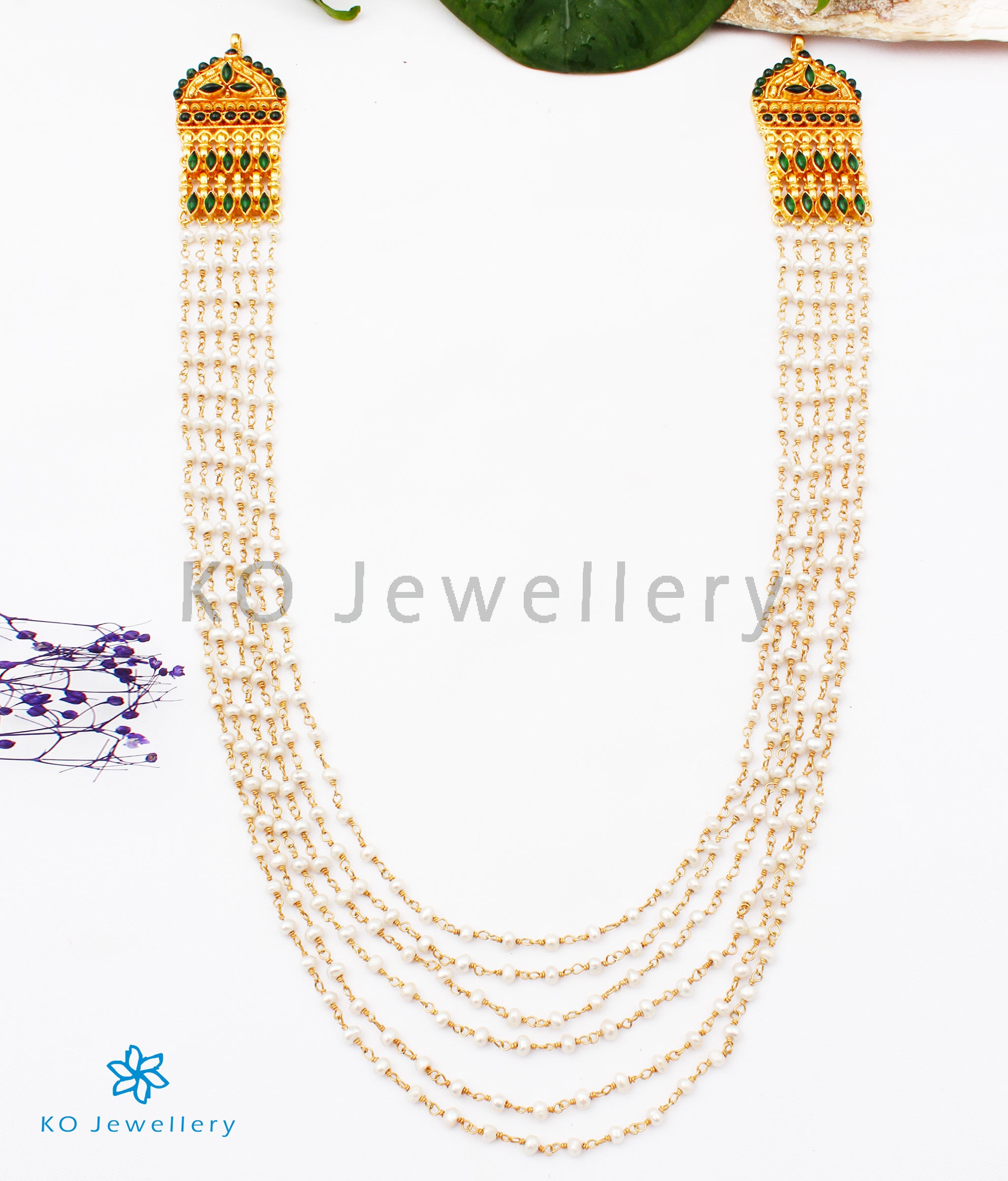 Delicate and feminine this necklace made up of dreamy pearls linked together with Sterling Silver (92.5%) wire is sure to steal your heart. It is made up of 6 pearl strands that are arranged in layers. The Pearl strands are held in place by two ornate pendants set with kempu stones.