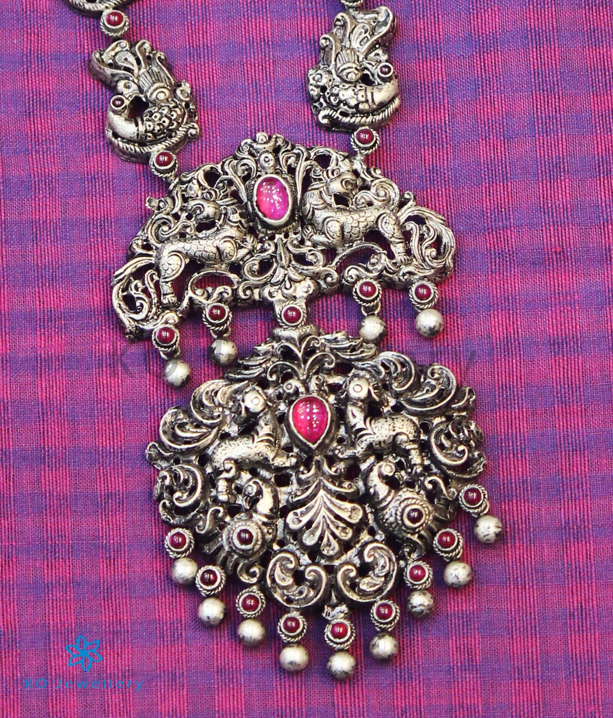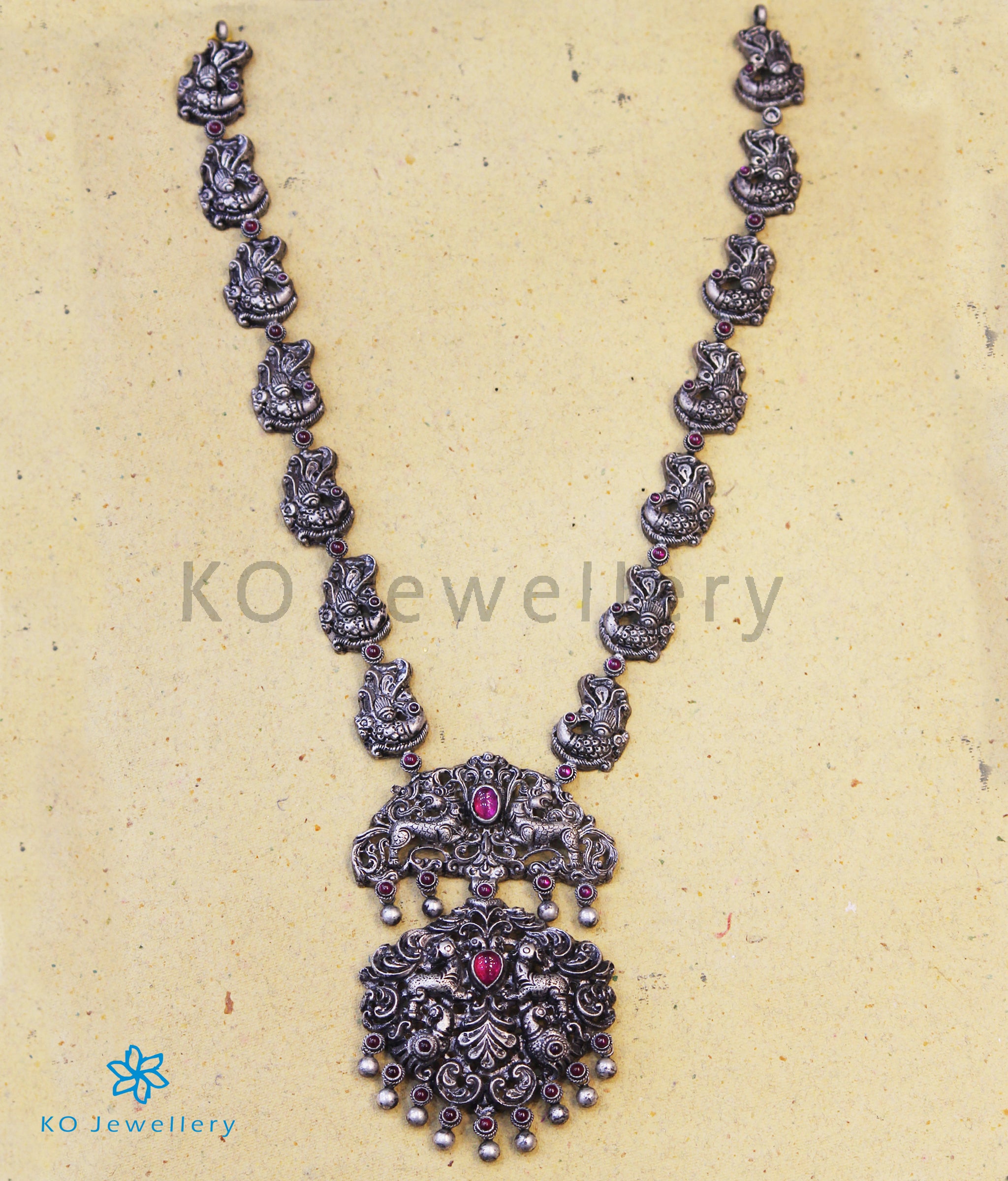 Let the beauty and grace of the peacock surround you with this gorgeous and long Sterling Silver (92.5%) necklace handcrafted with nakshi or nakkasi work.The necklace string is made up of a row of peacocks while the pendant carries the image of twin `Yalis' (a mythical creature,part lion, part elephant and part horse ; a motif used widely in temple architecture and jewellery) .