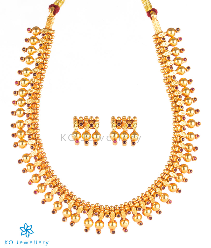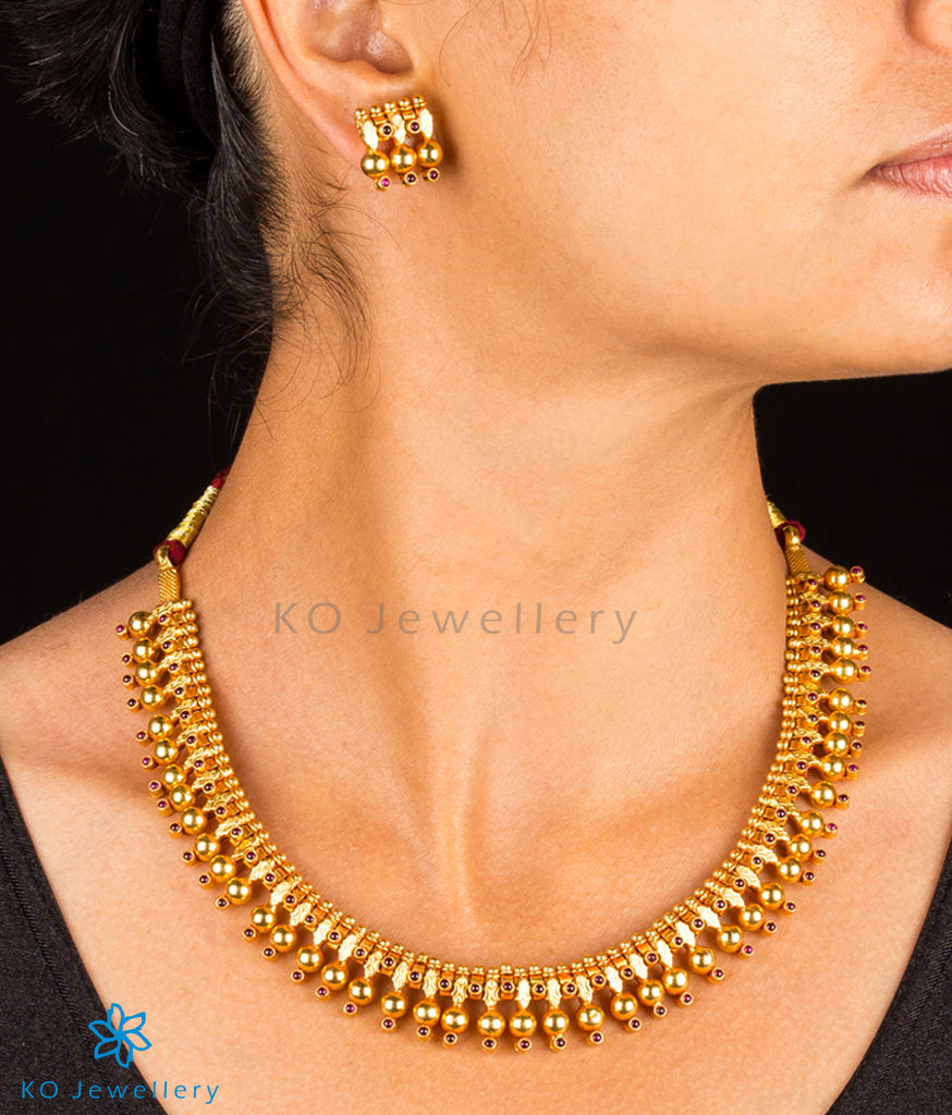 Crafted with care and precision this necklace is made up of numerous tiny pendants with golden beads that are strung on a flexible silver cord. Handcrafted using techniques used in ancient South Indian antique jewellery the necklace is made in Sterling (92.5) Silver and gold-dipped in a special process.This necklace comes with a pair of matching earrings. Price mentioned is for necklace & earrings both.