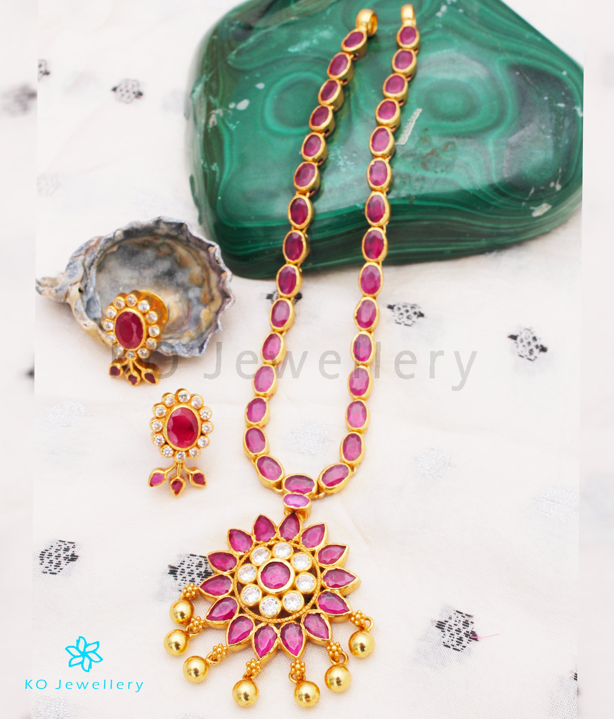 A gorgeous pendant set with kempu stones sits at the center of this sterling silver (92.5%) necklace. Fully handcrafted using techniques used in ancient South Indian antique gold temple jewellery this a striking piece of jewellery. It is paired with matching earrings.